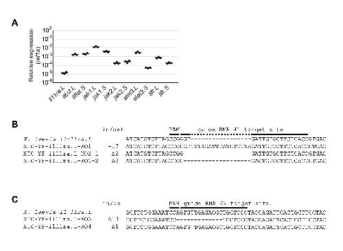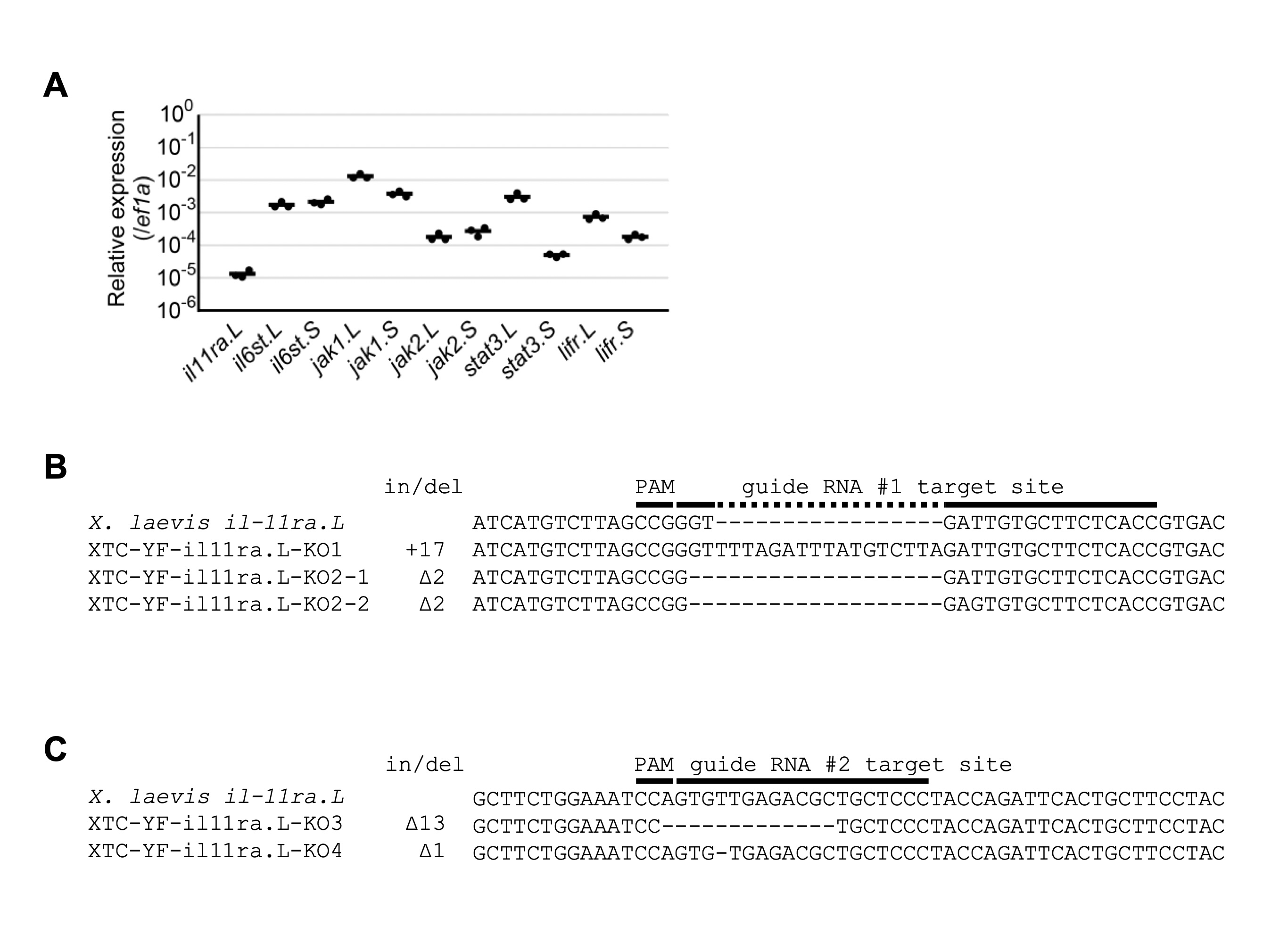 Supplementary Fig. S1 Expression of Il11 signaling molecules in XTC-YF culture cell line and establishment of XTC-YF il11ra.L KO cell lines. (A) Expression levels of genes related to Il11 signaling measured by quantitative RT-PCR using 3 lots of RNA extracted from XTC-YF. Relative expression levels of the genes normalized by those of ef1a are shown in logarithmic scale. Bars indicate the mean value. (B and C) Genomic il11ra.L sequences of established XTC-YF il11ra.L KO cell lines. (B) KO1 and KO2 were established with guide RNA #1, (C) KO3 and KO4 were established with guide RNA #2. PAM, protospacer adjacent motif.