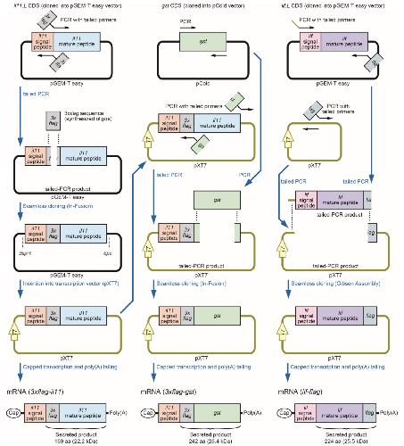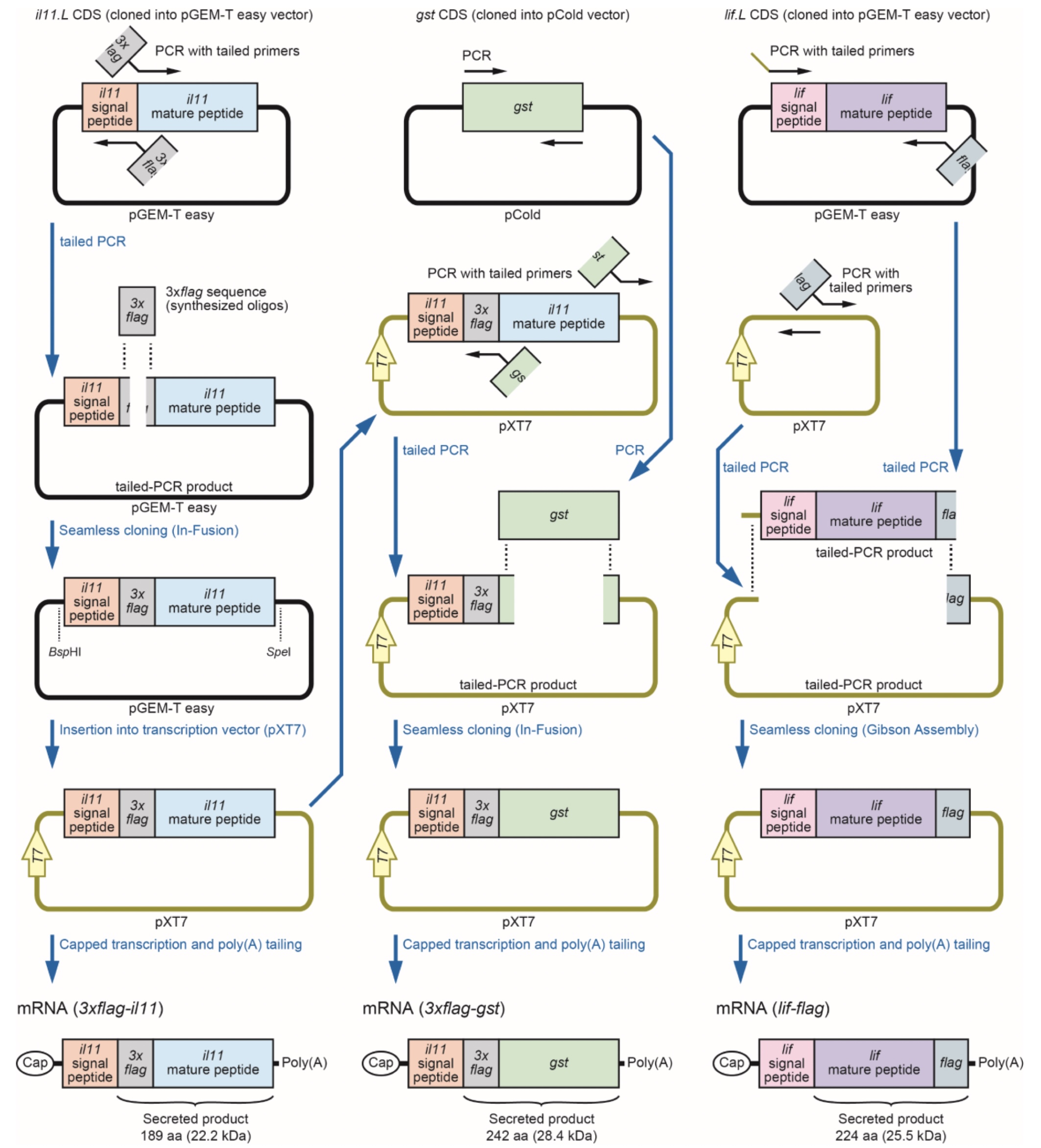 Supplementary Fig. S2 Construction of mRNAs of (left) N-terminal 3Ãflag-tagged il11.L, (center) N-terminal 3Ãflag-tagged gst, and (right) C-terminal flag-tagged lif.L.