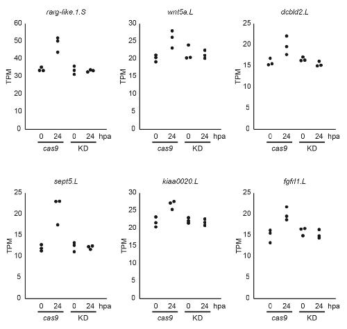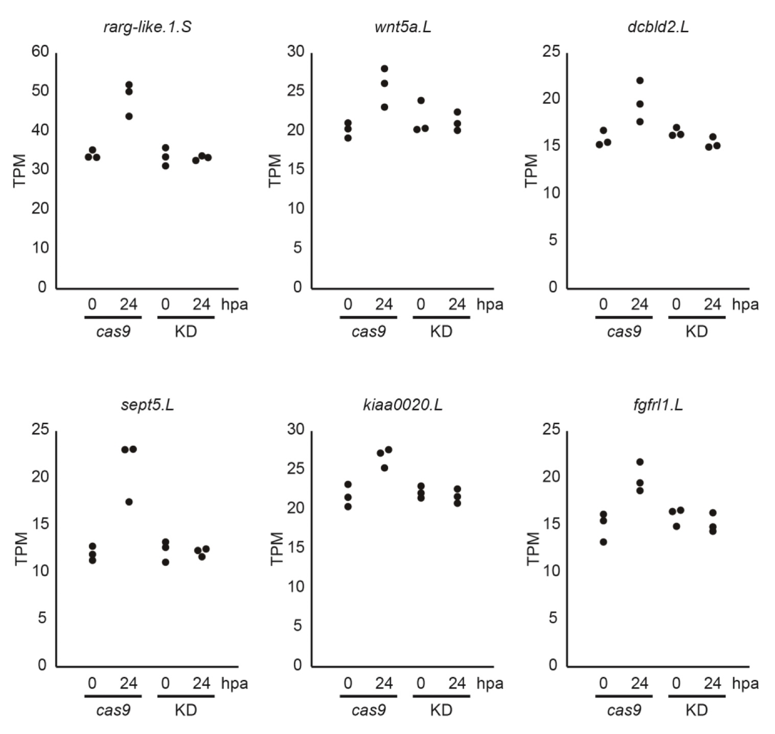 Supplementary Fig. S4 Expression of genes that are significantly upregulated in cas9 24 hpatail stumps compared with cas9 0 hpatail, and 0 and 24 hpail11ra.L KD tail stumps. TPM, transcriptions per million.