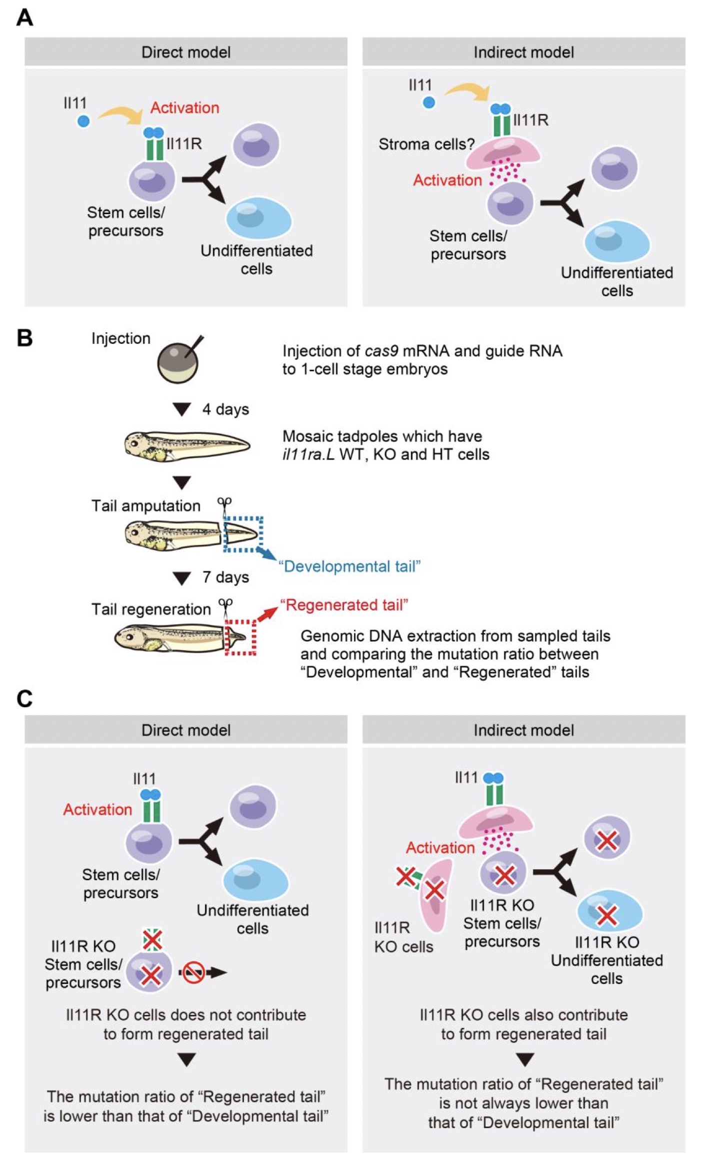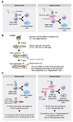 Supplementary Fig. S6 Schematic of the putative mechanism of Il11 function. (A) Putative models of the mechanism of Il11 function. Direct model; Il11 directly activates stem cells or precursors of each tissue in the tail. Indirect model; Il11 triggers downstream events that activate stem cells or precursors of each tissue in the tail. Il11R, Il11 receptor complex. (B) Experimental procedure.