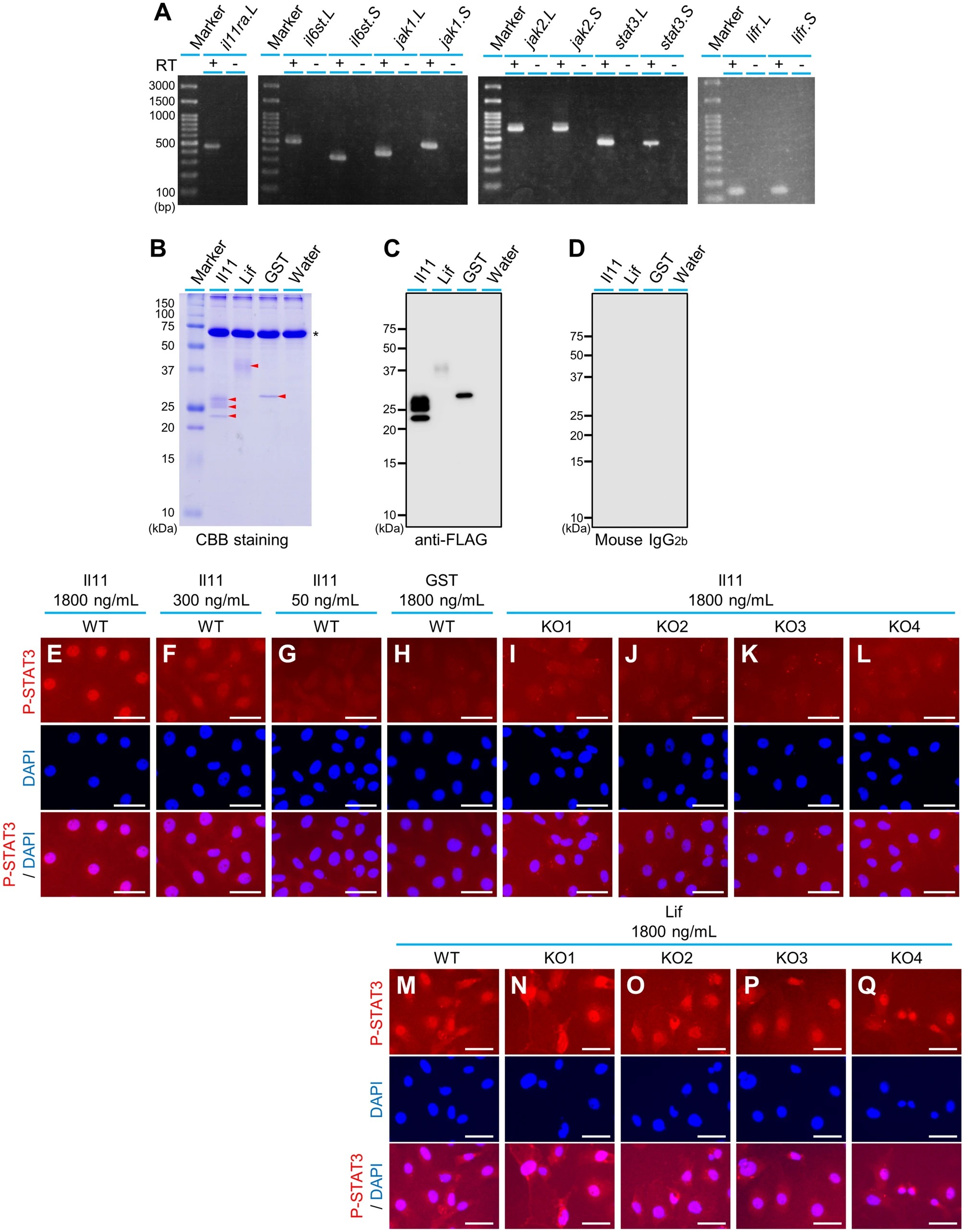 Figure 1. X. laevis Il11ra.L functions as an Il11 receptor component. (A) Gene expression involved in Il11 signaling in the XTC-YF cell line. (BâD) Oocyte culture supernatants were subjected to SDS-PAGE, followed by (B) CBB staining and (C) Western blotting using anti-FLAG antibody and (D) mouse IgG2b isotype control. Size of the synthesized proteins estimated by their amino acid sequences was: Il11, 22.2 kDa; Lif, 25.5 kDa; and GST, 28.4 kDa. Arrowheads in (B) indicate the synthesized proteins. The 66.4-kDa bands (asterisk) in (B) the CBB staining represent BSA contained in the culture medium. (EâQ) Detection of XTC-YF P-Stat3 nuclear translocation by immunostaining. (Top) P-Stat3 signal is shown in red. (Middle) Nuclei were stained with DAPI. (Bottom) Merged images of P-Stat3 and DAPI staining. Data shown are representative of 3 independent experiments (except the experimental condition of Il11 50 ng/mL; nâ=â2). Scale bars: 50 µm. Raw images of the gel and blots are shown in Fig. S8.