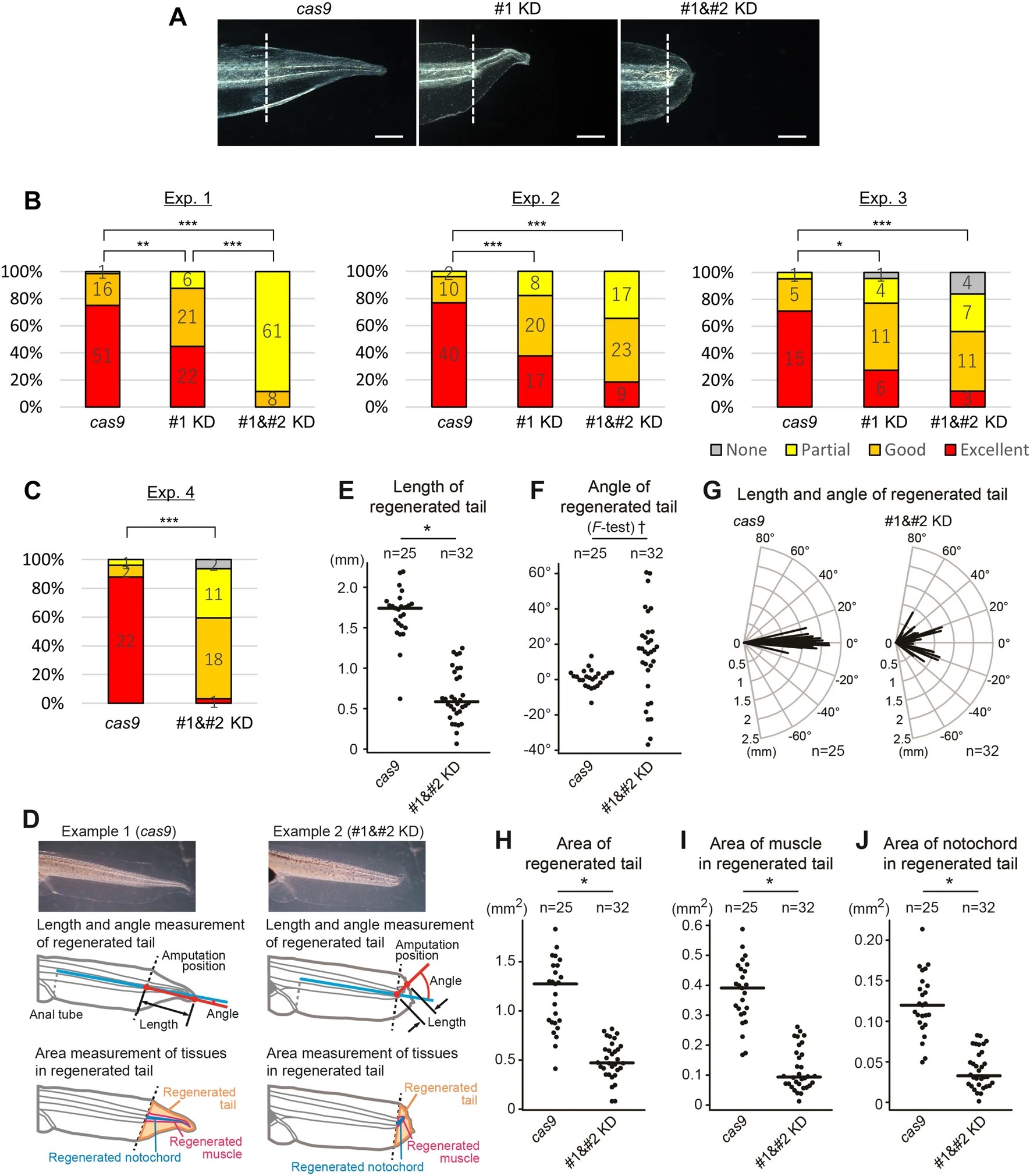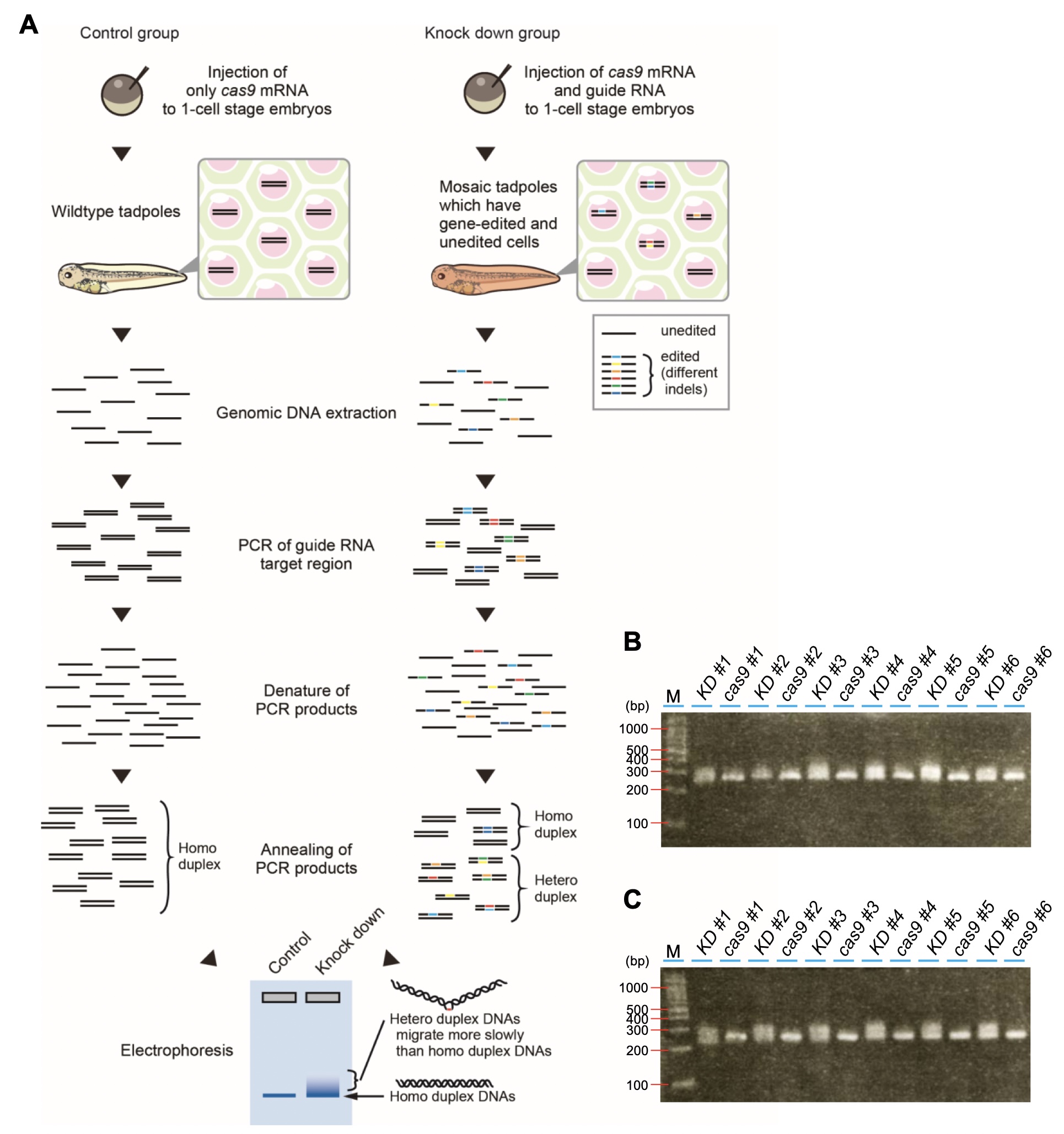 Supplementary Fig. S3 Heteroduplex mobility assay (HMA) for detection of gene editing. (A) Schematic figure of HMA. (B and C) HMA on amputated tails. Genomic loci including the target site of (B) guide RNA #1 or (C) #2 were amplified by PCR. Smeared bands representing multiple heteroduplexes are shown from the PCR products derived from embryos injected with guide RNA and cas9 mRNA (KD), whereas single bands are shown from control embryos injected with only cas9 mRNA (cas9). Numbers represent the serial numbers of samples. M, Marker lane. Full-length gel images are presented in Fig. S9.