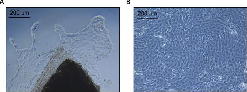 Fig. 3. Examples of cell outgrowth from frog skin tissue explants. An example of (A) early cell outgrowth (day 2 post-explant procedure) and (B) significant cell outgrowth (day 8 post-explant procedure) from frog ventral skin tissue explants. Scale bars = 200 µm. Images of R. sylvatica ventral skin explants are provided for illustrative purposes, however similar observations were made for X. laevis skin tissue explants.