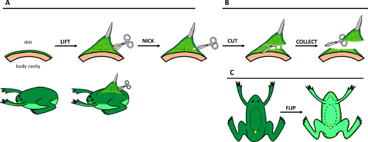 Fig. 1. The tissue dissection procedure. (A) The posterior end of dorsal or ventral skin is gently lifted using a pair of forceps to separate the skin from underlying tissue. The skin needs to be lifted only a small amount and the forceps should grip the skin on the posterior end of the desired skin tissue just above the nicking point (yellow dot) to minimize tissue damage. Note: the diagram exaggerates the position of the forceps relative to the initial nick in the skin and the amount of lift of the skin for illustrative purposes. (B) Holding the piece of skin tissue at the posterior end where the nick was made with the scissors, carefully cut along each side of the skin (dashed line), alternating between each side, to separate and collect the skin tissue from the frog. (C) Depictions of the dorsal (left) and ventral (right) regions of Xenopus laevis targeted for skin dissection. The yellow dot indicates the point to nick with the scissors and then hold with the forceps, while the dashed line indicates the oval skin tissue section to be excised.