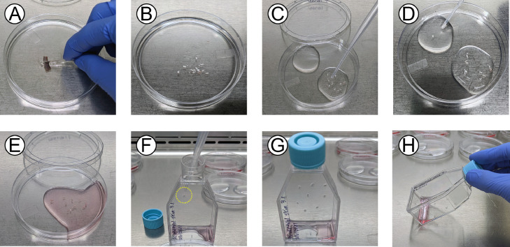 Fig. 2. The tissue explant procedure. (A) Cutting of larger dissected tissue pieces into smaller pieces. (B) Transfer of the smaller tissue pieces into APBS-A. (C) First wash of the tissue pieces in APBS-A. (D) Second wash of the tissue pieces in APBS-A. (E) Transfer of the tissue pieces to establishment medium. (F) Placement of individual tissue pieces on the bottom (vertical surface when standing) of a 25 cm2 flask. (G) Adherence of the tissue pieces to the flask. (H) Addition of fresh establishment medium to the bottom of the flask and transfer of the flask to its standard position.