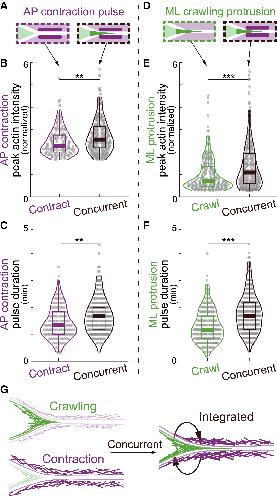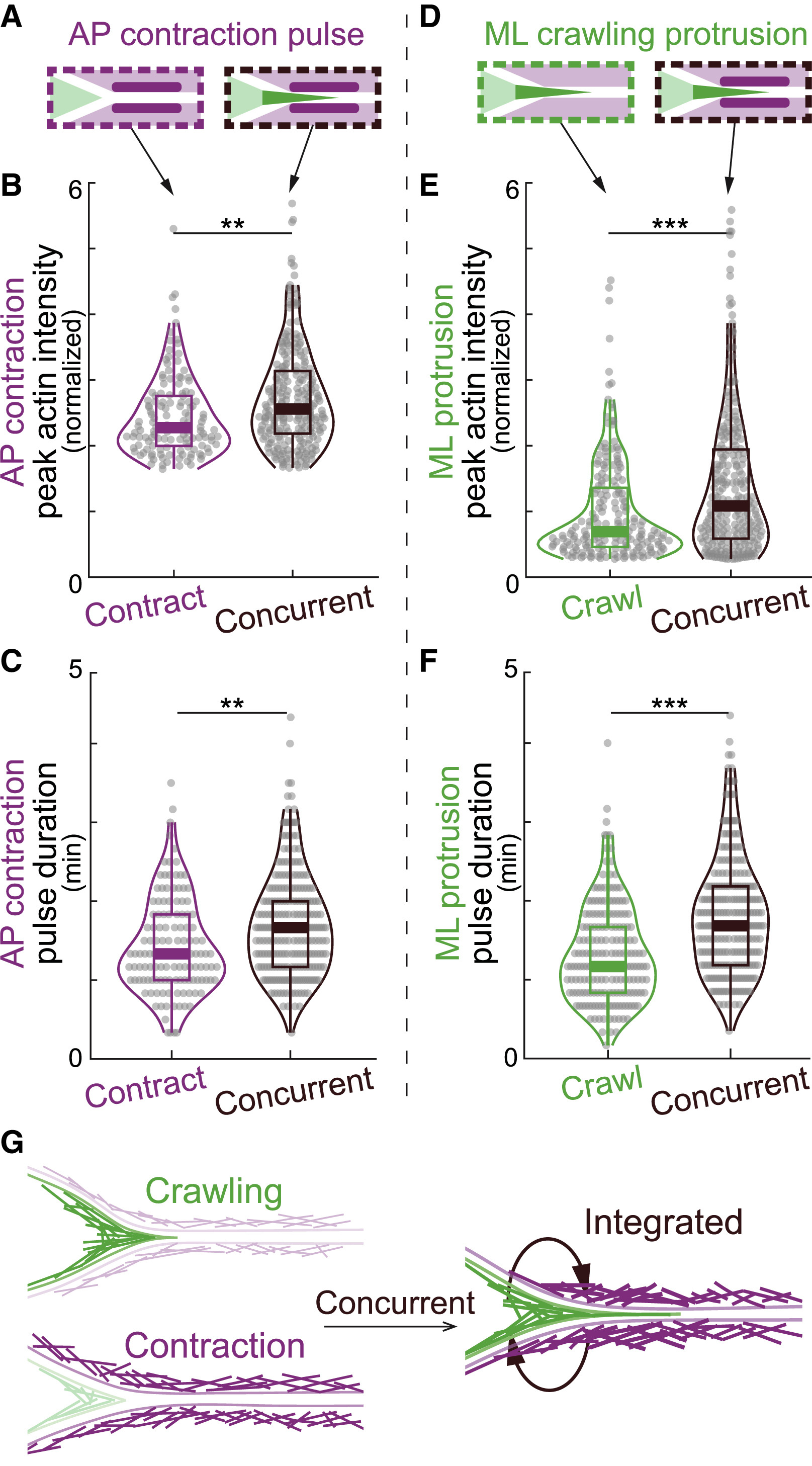 Figure 4. Integration of crawling and contraction enhances actin assembly (A) Schematic showing contraction pulses (purple) in contraction-only and concurrent steps. (B and C) Violin plots showing increased peak actin intensity (B) and pulse duration (C) of contraction pulses when they occurred concurrently with crawling pulses compared with contraction pulses occurring alone. (D) Schematic showing crawling protrusions (green) in crawling-only and concurrent steps. (E and F) Increased peak actin intensity (E) and pulse duration (F) of crawling protrusions when they occurred concurrently with contraction pulses compared with crawling protrusion occurring alone. (G) Schematic showing amplified actin assembly in crawling protrusions and contraction cortex when they are integrated during concurrent steps. p values are calculated using Wilcoxon rank sum test (A.K.A. Mann-Whitney U test). ∗p < 0.05; ∗∗p < 0.005; ∗∗∗p < 0.0005; NS, not significant. |
