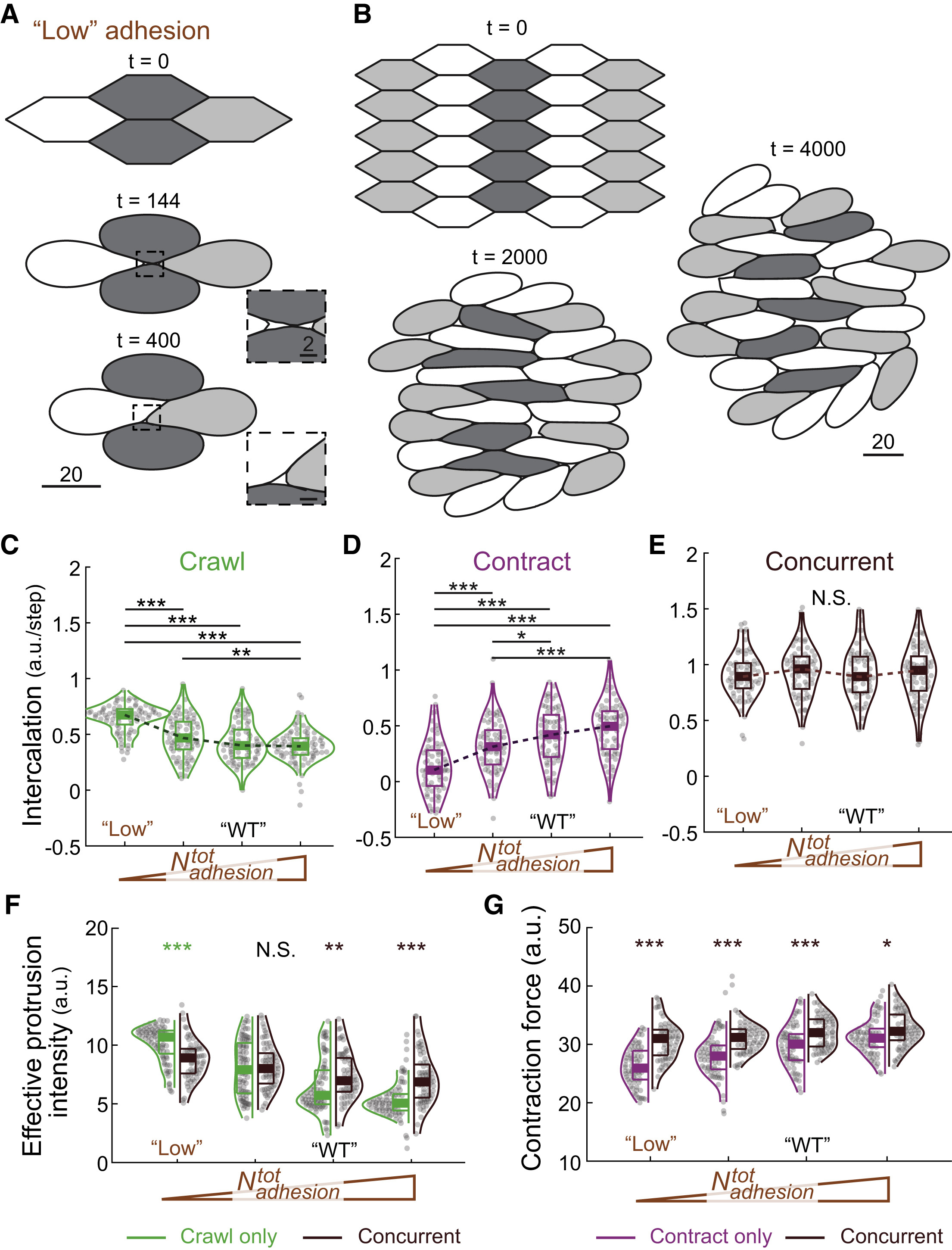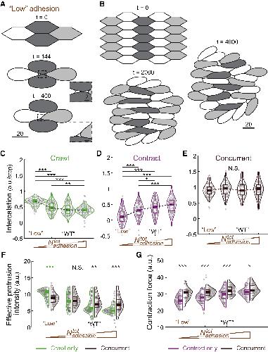 Figure 6. Role of cell adhesion in crawling and contraction (A) Representative simulation result of a four-cell model with low adhesion showing complete cell intercalation. Magnification in insets shows enlarged voids in multi-cellular regions. (B) Simulation result of a 27-cell model with low adhesion reduced tissue-wide convergent extension. (CâE) Effect of increasing adhesion on intercalation (vertex displacement) during crawling-only, contraction-only, and concurrent steps in the model. âWTâ marks the value used for simulating the wild-type condition in Figure 5. âLowâ marks the value used for simulating the low-adhesion condition in (A) and (B). (F) Effect of increasing adhesion on the effective protrusion intensity in crawling-only and concurrent steps. Enhanced protrusion intensity during concurrent steps is only observed with medium-high adhesion. (G) Effect of adhesion on contraction force in contraction-only and concurrent steps. Contraction force during concurrent steps is robustly increased in concurrent steps. p values are calculated using Wilcoxon rank sum test (A.K.A. Mann Whitney U test). âp < 0.05; ââp < 0.005; âââp < 0.0005; NS, not significant. See also Videos S4 and S5. |