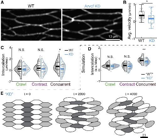 Figure 7. The Arvcf catenin is specifically required for integration of crawling and contraction (A) Still images of membrane-GFP-labeled cells showing that both wild-type and Arvcf-depleted cells were mediolaterally elongated. (B) Arvcf knockdown decreased average intercalation velocity. (C) Violin plots of intercalation (vertex displacement) in crawling-only, contraction-only, and concurrent steps. (D) Simulation results recapitulating the concurrent step-specific defect in intercalation. âKDâ marks the results using a set of parameters for simulating Arvcf depletion. (E) Representative simulation result of a 27-cell model with parameters simulating Arvcf depletion. Tissue-wide convergent extension is reduced. p values are calculated using Wilcoxon rank sum test (A.K.A. Mann Whitney U test). âp < 0.05; ââp < 0.005; âââp < 0.0005; NS, not significant. See also Figure S7. |
