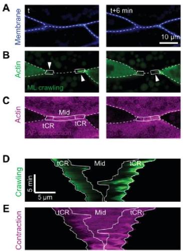 Figure S1. Representative images from a second example. Related to Figure 1 and Movie S1. (A-C) Still images from another representative time-lapse movie (Movie S1, Example 2) showing in (A) membrane (blue), in (B) actin in the ML protrusions for crawling (green, arrowheads) and in (C) actin at the AP interface for contraction (purple). Dashed lines mark cell-cell interfaces. Boxes mark tCRs and the middle region (“Mid”). (D, E) Kymograph along the AP cell interface shows spatiotemporal dynamics of actin from the ML protrusions representing the “crawling” signal (D) and actin from the AP cells representing the “contraction” signal (E). White lines outline the tCRs. |