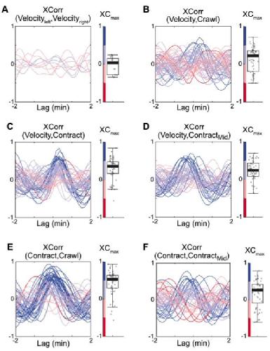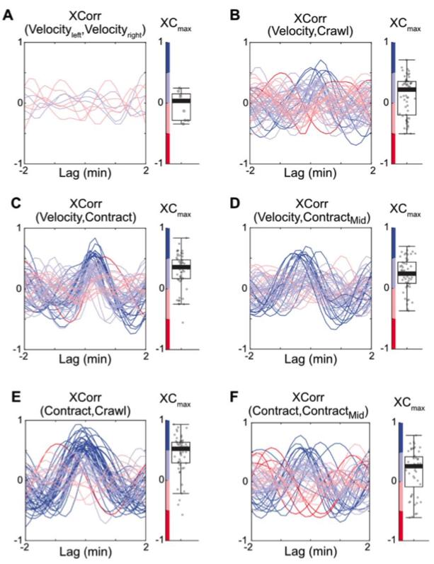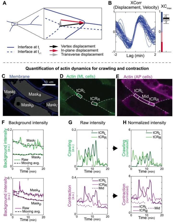Figure S3. Cross-correlation analysis of cell intercalation velocity and bulk actin dynamics. Related to STAR Methods. (A) Low cross-correlation between intercalation velocity from a paired left and right tricellular vertices sharing the same AP interface. n = 9. (B-D) Low cross-correlation between cell intercalation velocity and bulk actin dynamics for crawling (B), tCR contraction (C), and Mid contraction (D). (E) Strong cross-correlation between actin dynamics for crawling and tCR contraction. (F) Low cross-correlation between actin dynamics for tCR contraction and Mid contraction, demonstrating spatial heterogeneity along the AP interface. All show a wide range of correlation with variable lag time. Each line represents cell intercalation and actin dynamics at one tCR. n > 53. |