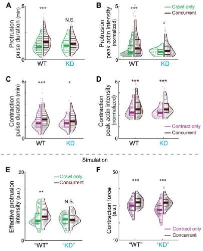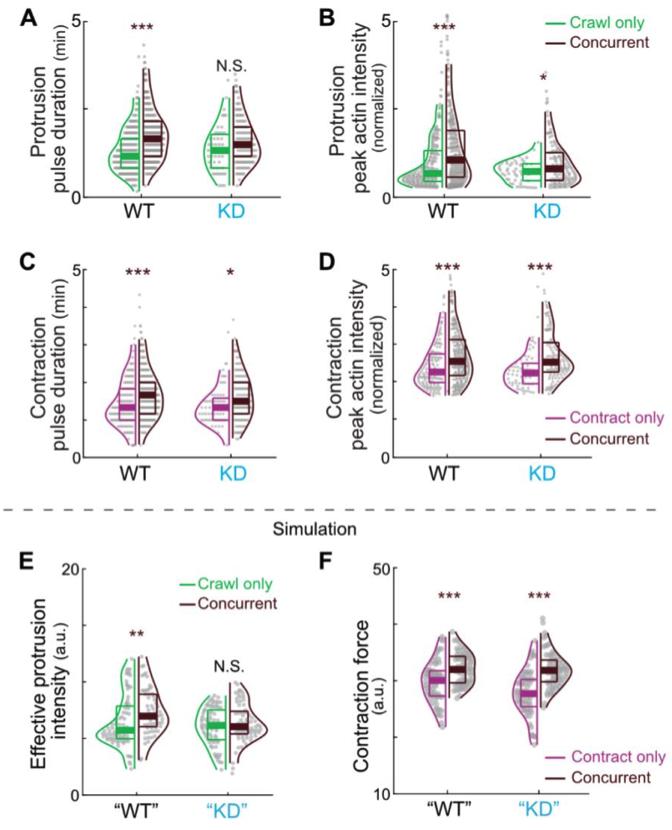 Figure S7. Supplementary results of Arvcf knockdown. Related to Figure 7. (A) Violin plots showing that elongated protrusion duration during concurrent steps normally observed was disrupted in Arvcf depleted cells. (B) Violin plots showing that amplified protrusion assembly during concurrent steps normally observed was diminished in Arvcf depleted cells. (C) Violin plots showing that elongated contraction pulse duration during concurrent steps was not altered in Arvcf depleted cells. (D) Violin plots showing that amplified contraction pulses during concurrent steps was not altered in Arvcf depleted cells. (E) Modeling results showing diminished amplification of the effective protrusion intensity during concurrent steps with the âKDâ parameters. (F) Modeling results showing no difference on the amplification of contraction force during concurrent steps with the âKDâ parameters. |