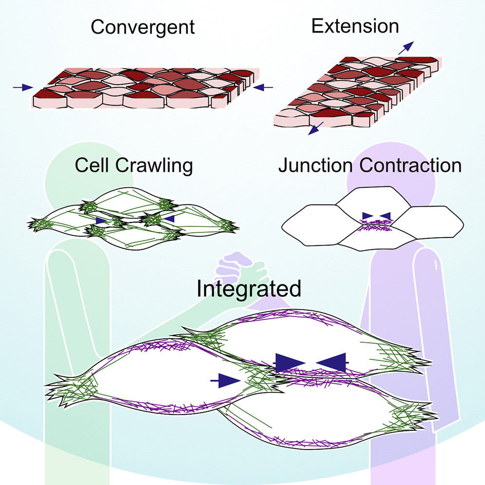 Convergent extension (CE) is an evolutionarily conserved collective cell movement that elongates several organ systems during development. Studies have revealed two distinct cellular mechanisms, one based on cell crawling and the other on junction contraction. Whether these two behaviors collaborate is unclear. Here, using live-cell imaging, we show that crawling and contraction act both independently and jointly but that CE is more effective when they are integrated via mechano-reciprocity. We thus developed a computational model considering both crawling and contraction. This model recapitulates the biomechanical efficacy of integrating the two modes and further clarifies how the two modes and their integration are influenced by cell adhesion. Finally, we use these insights to understand the function of an understudied catenin, Arvcf, during CE. These data are significant for providing interesting biomechanical and cell biological insights into a fundamental morphogenetic process that is implicated in human neural tube defects and skeletal dysplasias.