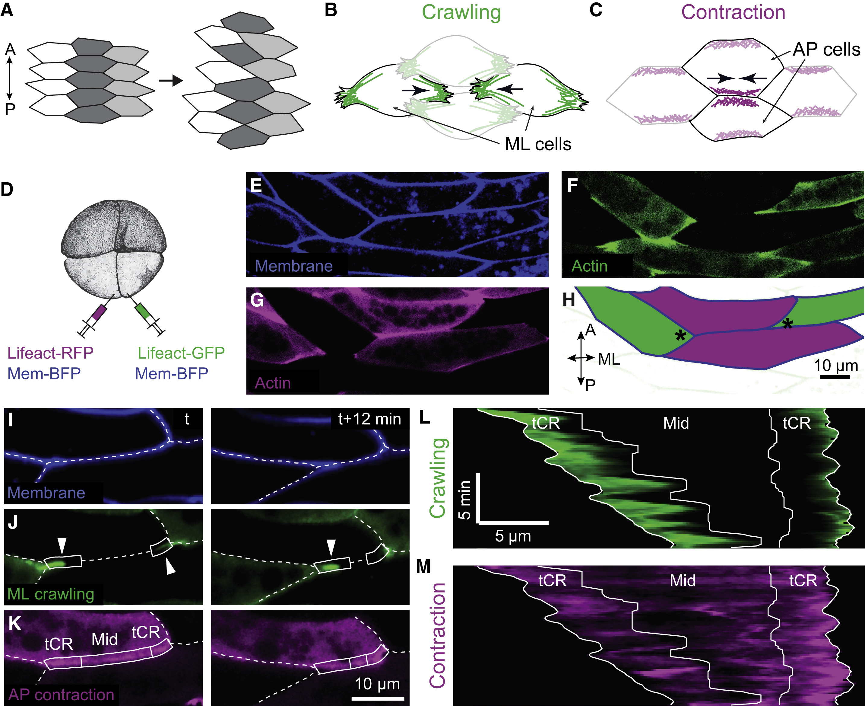 Figure 1. Mosaic labeling showing dynamics of distinct actin populations for crawling and contraction during convergent extension (A) Illustration of convergent extension showing tissue elongation in the AP axis by cell intercalation in the orthogonal direction. (B) Sketch showing crawling mode of convergent extension in four cells with actin in ML protrusions in green. (C) Sketch showing contraction mode of convergent extension in four cells with actin at AP interfaces in purple. (D) Schematic illustrating mosaic labeling technique in a Xenopus embryo. (E and F) Representative images showing uniform labeling of membrane-BFP (E) and mosaic labeling of different colors of an actin biosensor (Lifeact-GFP [F] and Lifeact-RFP [G]). (H) Example showing actin in AP cells labeled in one color and ML cells in another. Asterisks mark representative tCRs for later analysis. (IâK) Still images from a representative time-lapse movie (Video S1, Example 1) showing membrane (I, blue), actin in the ML protrusions for crawling (J, green, arrowheads), or actin at the AP interface for contraction (K, purple). Dashed lines mark cell-cell interfaces; boxes mark tricellular regions (âtCRâ) and the middle region (âMidâ); see text for details. (L and M) Kymograph along the AP cell interface showing spatiotemporal dynamics of actin from the ML protrusions representing the âcrawlingâ signal (L) and actin from the AP cells representing the âcontractionâ signal (M). |
