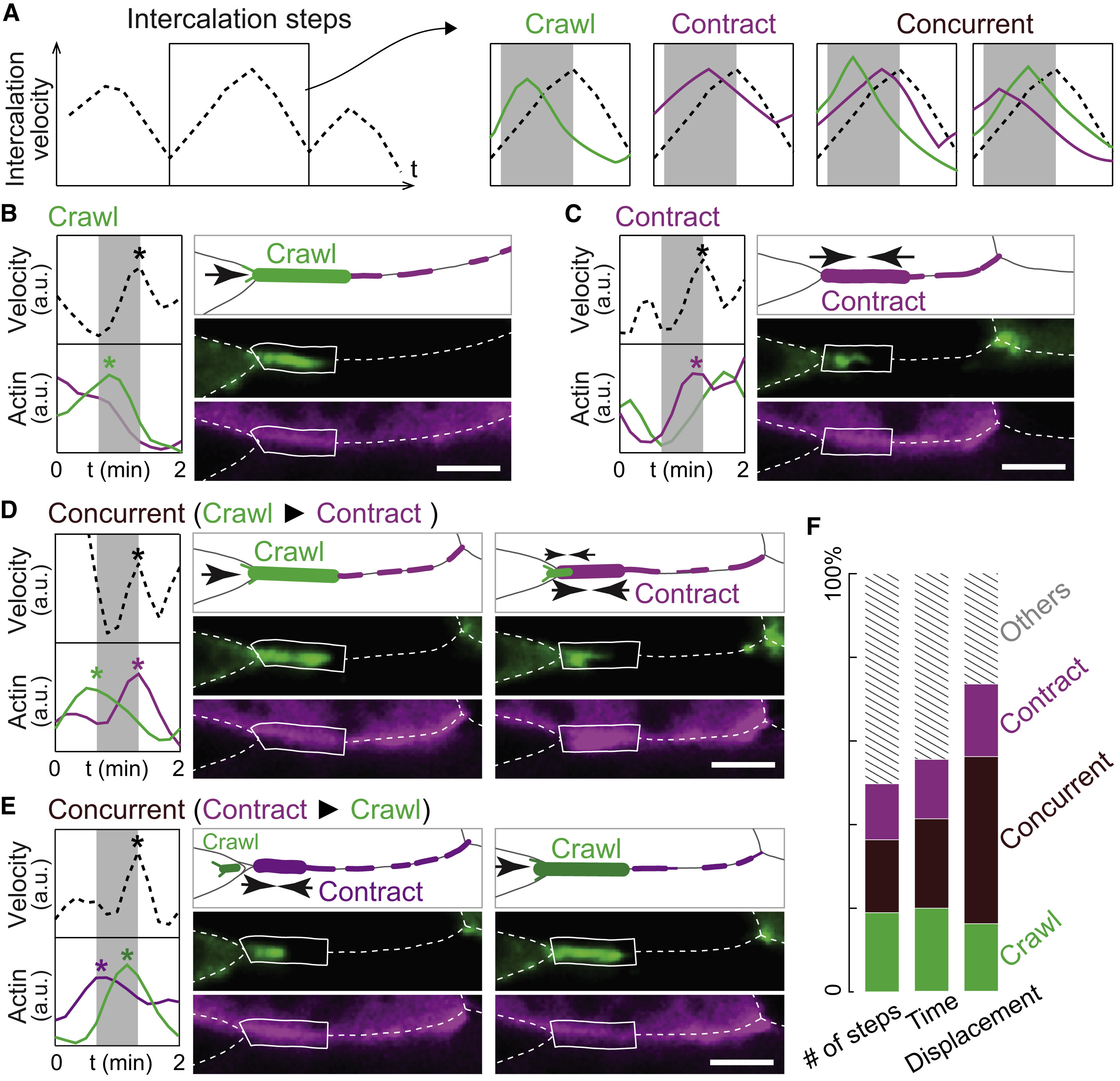 Figure 2. Direct quantification of crawling- and contraction-based cell intercalation during convergent extension (A) Method for intercalation step analysis. Left, intercalation steps were identified as individual peaks on the trace of intercalation velocity. Right, each step is categorized based on its correlation with peaks in the crawling and/or contraction signals (green and purple, respectively). Gray boxes mark the 40-s time window for correlational analysis. (BâE) Examples of crawling-only (B), contraction-only (C), and concurrent intercalation steps (D and E). Each shows traces of intercalation velocity and actin dynamics (left), a schematic (top-right), and still frames (bottom-right) from time-lapse data. Asterisks mark the correlated peaks of velocity, crawling, and/or contraction. (F) Stack plots showing in percentile the number of steps, accumulative time of each step, and total displacement of cell intercalation for each category as indicated. Intercalation steps having no correlation with crawling or tCR contraction were labeled as âOthers.â |