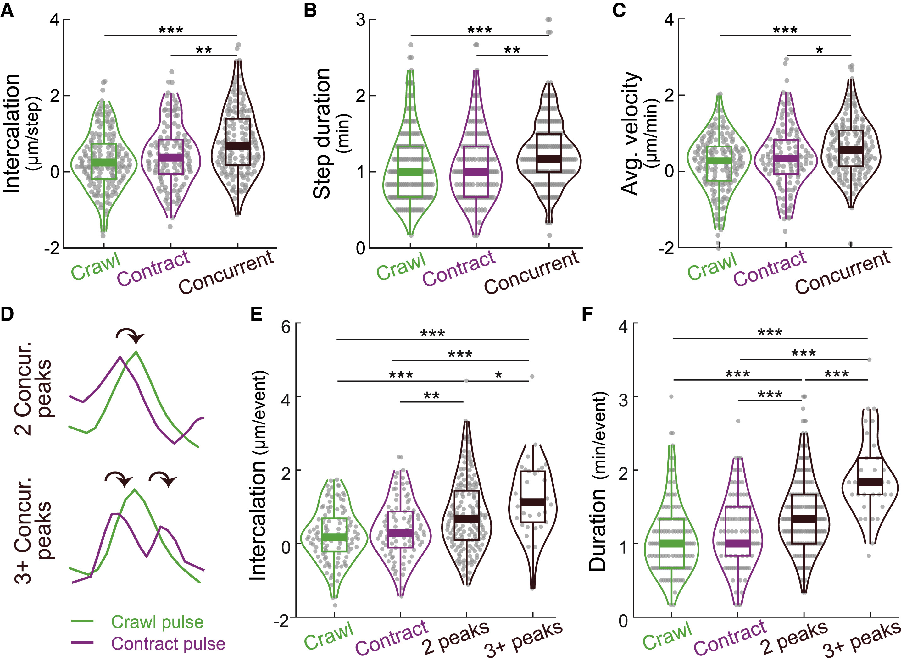 Figure 3. Concurrent crawling and contraction improve the efficacy of cell intercalation (A) Concurrent steps produce significantly greater intercalation than do crawling or contraction steps. (B and C) Concurrent steps increase both the step duration and average intercalation velocity. (D) Sketch showing multiple concurrent crawling and contraction pulses (“3 + Concur. peaks”). (E and F) Multiple concurrent crawling and contraction pulses (“3 + peaks”) further improve the intercalation displacement and duration. p values are calculated using Wilcoxon rank sum test (A.K.A. Mann-Whitney U test). ∗p < 0.05; ∗∗p < 0.005; ∗∗∗p < 0.0005; NS, not significant. |