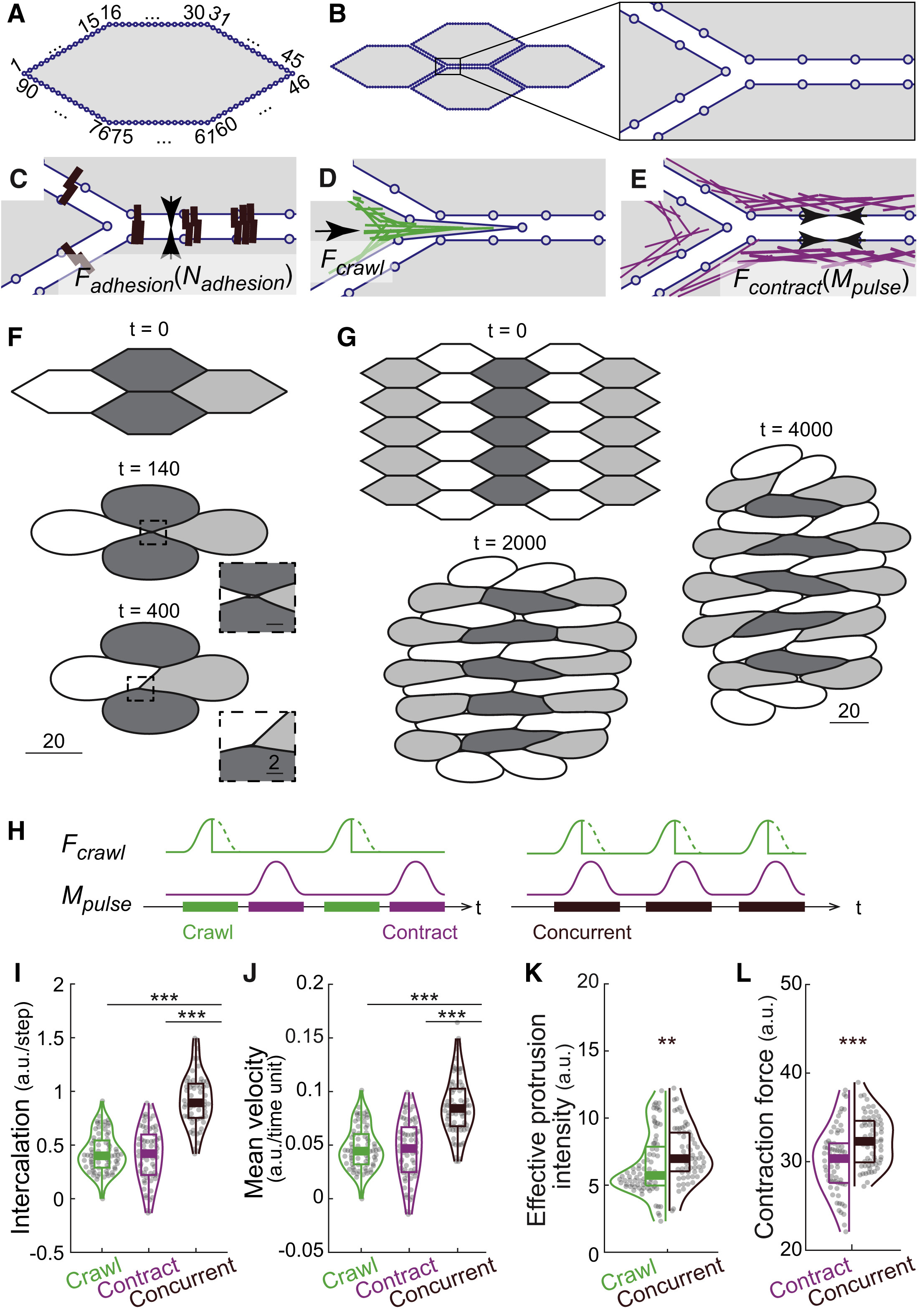Figure 5. A vertex model provides insights into the biomechanics of crawling-contraction integration (A) Each individual cell was modeled as a 90-vertex polygon. (B) A four-cell model, with cell-cell interfaces modeled as independent entities. (CâE) Schematic focused on the boxed region in (B), showing the design for subcellular modeling behaviors. (C) Cell-cell interfaces were connected via cell adhesion clusters of , holding adhesive forces of . (D) Crawling forces were applied to ML vertices around tricellular regions. (E) Contraction forces were added to cell cortex, which is a function of the amount of actomyosin density including the pulsatile component . (F) Representative simulation result of a four-cell model; magnification in insets reveals minimal extracellular gaps between cells. (G) Representative simulation result of a 27-cell model, showing not only cell intercalation but also tissue-wide convergent extension. (H) Schematic showing timepoints for crawling forces and contraction pulses, so crawling-only or contraction-only intercalations steps can be distinguished from concurrent steps. (I and J) The model recapitulates enhanced intercalation displacement and higher velocity for concurrent steps compared with crawling or contraction alone. (K and L) Violin plots showing synergistic effect of integration on effective protrusion intensity (K) and AP contraction force (L), recapitulating experimental observations (see Figure 4). p values are calculated using Wilcoxon rank sum test (A.K.A. Mann Whitney U test). âp < 0.05; ââp < 0.005; âââp < 0.0005; NS, not significant. See also Figures S5 and S6. |