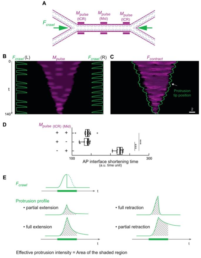 Figure S5. Design of crawling and contraction in a four-cell model. Related to Figure 5 and STAR Methods. (A) Schematic showing the application of crawling force and actomyosin pulses . Crawling forces on the left and right cells were applied on the tricellular vertices at randomized timepoints and toward each other exclusively. Actomyosin pulses were applied at both tricellular regions and the middle of the AP interface. (B) Representative simulation input of crawling force and actomyosin pulses. Green traces show the profile of crawling forces on the left and right tricellular vertices. Purple kymograph shows the spatiotemporal dynamics of the applied actomyosin pulses along the shortening AP interface. (C) Simulation results from the input in (B). Purple kymograph shows the calculated contraction forces along the AP interface. Green traces mark the tip of the protrusions from the left and right cells. (D) Bar plot showing the insignificance of actomyosin pulses from the middle region of an AP interface. (E) Schematic showing the definition of the proxy for protrusion actin assembly. Depending on the cell-cell interaction, protrusion profile varies with the same applied crawling force. The integral of protrusion length over time, defined as the effective protrusion intensity, was used as a proxy for the protrusion actin assembly dynamics. |