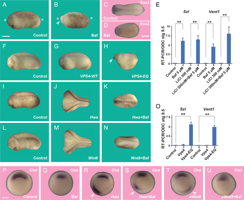Figure 4. Dorsal cytoplasmic determinant activity requires lysosomal acidification and the ESCRT machinery; Hwa signaling is inhibited by Bafilomycin. (A and B) Immersion of Xenopus embryos at the 32-cell stage in 5 µM Baf for 7 min results in a partially ventralized phenotype with microcephaly, loss of cement gland, and pigmentation in ventral and posterior ectoderm. A, anterior; P, posterior. (C and D) Baf reduces the panneural marker Sox2. (EâG) Inhibiting ESCRT machinery with Vps4-EQ, but not Vps4-WT, mRNA (two dorsal injections of 400 pg at the four-cell stage) reduces axis formation. Arrowhead indicates microcephaly. (HâJ) Microinjection of xHwa mRNA (10 pg one time ventrally at the four-cell stage) induces complete secondary axes that are blocked by Baf incubation at the 32-cell stage. (KâM) The xWnt8 mRNA second axes are also inhibited by the V-ATPase inhibitor Baf. (N) The qRT-PCR of blastula embryos showing that Baf treatment at the 32-cell stage increases expression of the ventral markers Szl and Vent1 in wild-type and LiCl-treated embryos. (O) The qRT-PCR of blastula embryos showing that inhibiting the ESCRT machinery with the Vps4-EQ point mutation increases transcription of the ventral markers Szl and Vent1 in Xenopus. (PâU) In situ hybridizations of chordin at the gastrula stage showing partial inhibition of the organizer by Baf in control, Hwa, and xWnt8 axes; arrowheads indicate ectopic chd expression. Numbers of embryos analyzed were as follows: A = 94; B = 77; E = 89; F = 62; G = 46; H = 235; I = 67; J = 71; K = 182; L = 57; M = 70 (two independent experiments). (Scale bars, 500 μm.) The qRT-PCR experiments represent biological triplicates; error bars denote SEM (n ⥠3) (**P < 0.01). See also SI Appendix, Figs. S5âS8. |