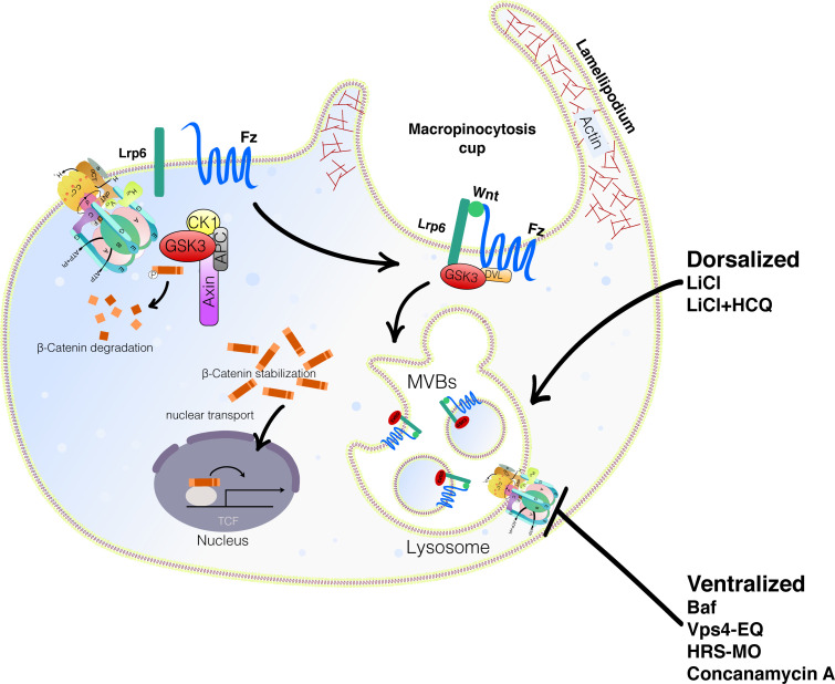 Fig. 5. Model of membrane trafficking during Wnt signaling highlighting the role of macropinocytosis, V-ATPase, MVBs, and lysosomes. Binding of Wnt to the Frizzled (Fz) and Lrp6 receptors results in a local inhibition of GSK3 activity that induces the actin machinery to form lamellipodia that engulf large amounts of liquid through macropinocytosis. In the presence of Wnt, plasma membrane is trafficked into MVBs that become lysosomes as they are activated by progressively decreasing pH. V-ATPase pumps protons into the lysosomal lumen, driving lysosomal acidification. Inhibiting V-ATPase (Baf or Concanamycin A) or MVB formation (Vps4-EQ or Hrs-MO) results in microcephalic embryos with increased ventral structures. LiCl mimics Wnt signaling by inhibiting GSK3, and low-dose HCQ expands the MVB compartment, facilitating Wnt signaling in mammalian cells and the dorsalization of Xenopus embryos. |