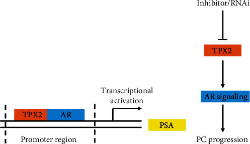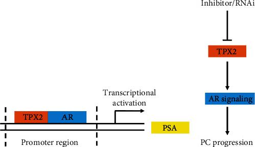 Figure 8. Schematic of TPX2 roles in prostate cancer progression. TPX2 enhanced the transcription factor activation of AR (a), inhibiting TPX2 is a potential therapeutic target against prostate cancer progression via AR signaling suppression (b).