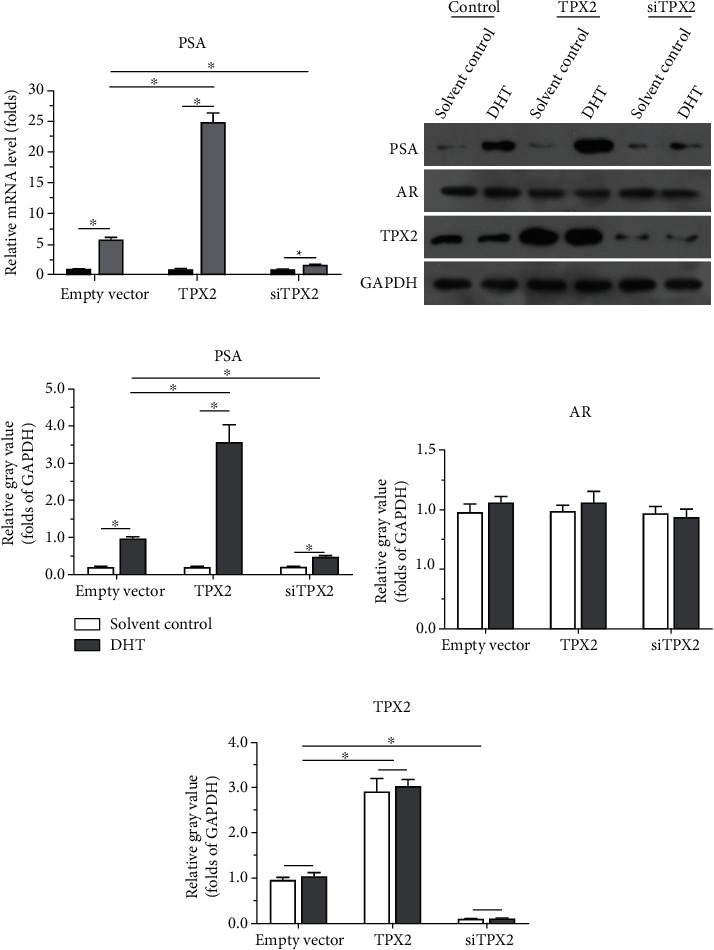 Figure 2. TPX2 enhanced the mRNA or protein expression of AR's down gene PSA in LNCaP cells. LNCaP cells were transfected with plasmids (control, TPX2, or siTPX2). Then, cells were harvested for qPXR or Western blot experiments. The mRNA level of PSA was examined by qPCR and shown as mean ± SD (a). The protein level of PSA or TPX2 was examined by Western blot, and the results were shown as the images of Western blot (b) or the quantitative results of the images (c–e). ∗P < 0.05.