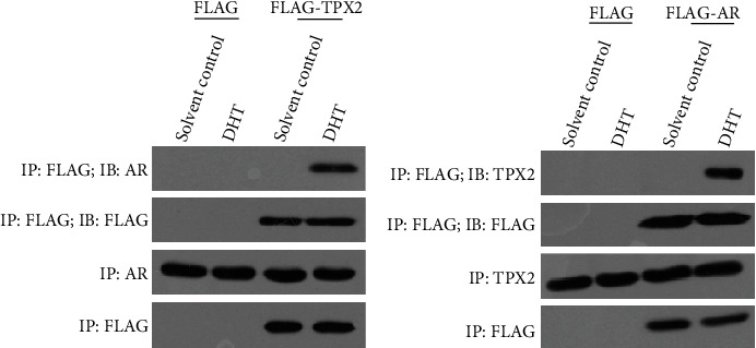 Figure 3. TPX2 interacted with AR in LNCaP cells. LNCaP cells were transfected with FLAG, FLAG-TOX2 (a) or FLAG, FLAG-AR (b) and harvested for the IP assays. The results were shown as images of Western blot.