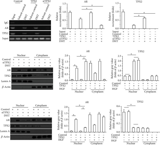 Figure 4. TPX2 enhanced the recruitment of AR to the PSA's promoter region or the accumulation of AR in nucleus. LNCaP cells were transfected with plasmids. The recruitment of AR to PSA's promoter was examined by ChIP (a). The accumulation of AR in nucleus was examined by the subcellular fraction (b and c). The results were shown as the images or the quantitative results. ∗P < 0.05.