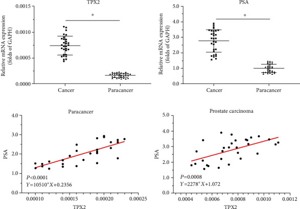 Figure 5. The clinical significance of the TPX2-AR axis. (a and b) The mRNA level of TPX2 (a) or PSA (b) in prostate carcinoma or nontumor specimens was examined by qPCR. (c and d) The relationship between the expression of TPX2 with PSA was shown as scatter plot images. ∗P < 0.05.