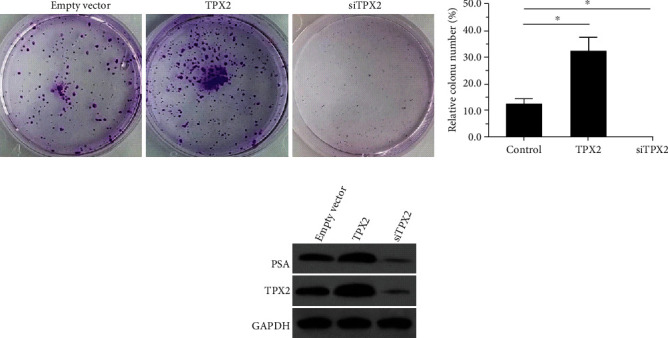 Figure 6. TPX2 enhanced the in vitro proliferation of LNCaP cells. LNCaP cells were transfected with plasmids and analyzed by the colony formation. The results were shown as the images of colonies (a) or the quantitative results of colony images (b). The expression level of PSA or AR in LNCaP cells was examined by Western blot (c). ∗P < 0.05.