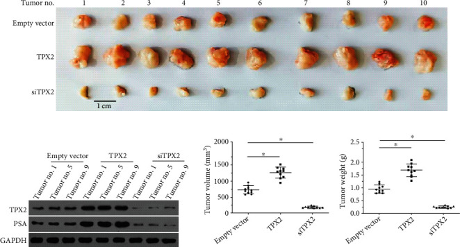 Figure 7. TPX2 enhanced the in vitro proliferation of LNCaP cells. LNCaP cells were transfected with plasmids and injected into the nude mice to form subcutaneous tumors. The results were shown as the images of tumor tissues (a), or the quantitative results of tumors according to the tumor volumes (c), or tumor weights (d). The expression level of PSA or AR in tumor tissues was examined by Western blot (b). ∗P < 0.05.