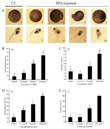 Figure 2. BPA induces malformation during X. tropicalis embryonic development. The embryos were exposed to different concentrations of BPA for 12 h; when the BPA was removed, the embryos were at stage 10.5 (early gastrula) ((A) 1–5), and the malformation analysis ended at the later tadpole stage 46 ((A) 6–10). The malformation rates were statistically analyzed at 12 h (stage 10.5) (B) and 72 h (stage 46) (D). The mortality rates were statistically analyzed at 12 h (stage 10.5) (C) and 72 h (stage 46) (E). Different letters above the bars indicate significant differences among groups (a > b > c > d, p < 0.05). n = 300/treatment.