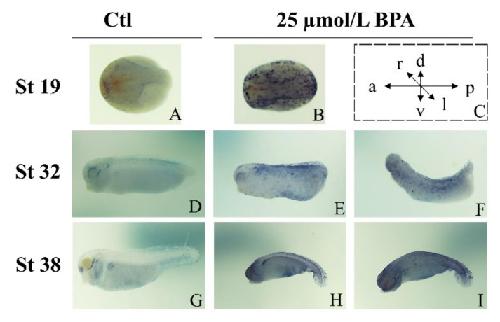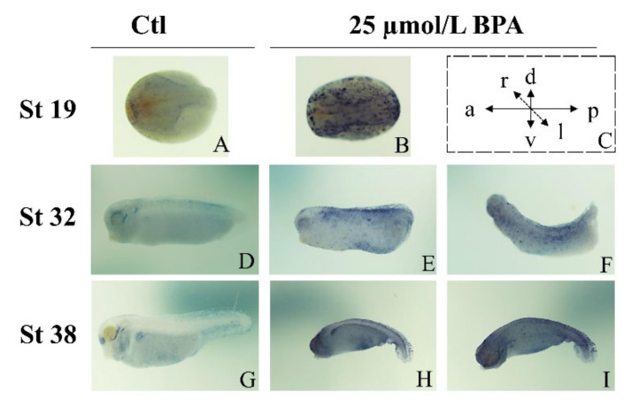Figure 4. BPA exposure disrupts the spatiotemporal Nrf2 expression patterns during embryonic development, determined using whole-mount in situ hybridizations; representative phenotypes are shown for the control (A,D,G) and treated (B,E,F,H,I) groups, according to the scheme in (C): a, anterior; p, posterior; v, ventral; d, dorsal; r, right; l, left (C). n = 9/treatment.