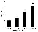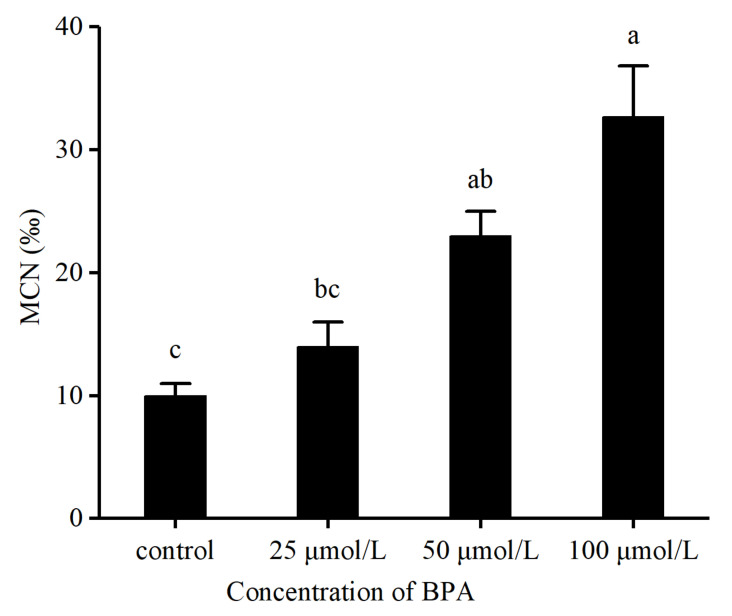 Figure 1. BPA exposure causes later micronuclei in blood cells. The tadpoles were exposed to BPA for 6 h before refreshing the water, and the micronucleus rate was measured again after 24 h. Different letters above the bars indicate significant differences among groups (a > b > c, p < 0.05). n = 3/treatment.