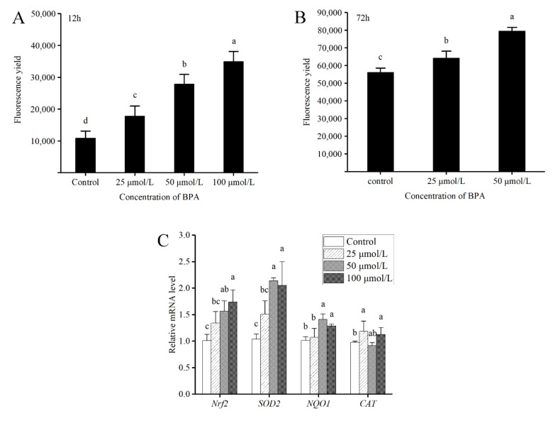 Figure 3. BPA exposure enhances redox signaling during embryonic development. The ROS levels were measured at the time of BPA removal (after exposure for 12 h) (A) and at the statistical analysis endpoint (72 h) (B). n = 3/treatment. (C) The representative genes involved in the redox signaling pathway were determined at the time of BPA removal (12 h). Different letters above the bars indicate significant differences among groups (a > b > c > d, p < 0.05). n = 3/treatment.