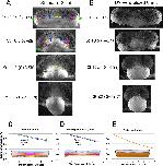 Figure 2. Early Convergence is uniform across regions. Frames from time lapse movies of standard giant sandwich explants (A; Video 2*, left) or ventralized standard giants (B; Video 3*) after release from their constraining coverslips show uniform convergence of the IMZ. The upper limits of the upper and lower IMZ are indicated by dashed yellow and pink lines, respectively (A). To compare regional rates of convergence in such explants, the mediolateral extent of the dorsal (A, between blue pointers), lateral (between blue and magenta pointers), and ventral regions (between magenta and green pointers) of the IMZ were measured at times from Stage 10- and plotted with respect to initial width (Wt/Wi) in standard (dorsally centered) giants (n = 3â5 embryos per time point) (C) and ventrally centered giants (n = 4â5 embryos) (D). The convergence of the entire IMZ was also measured in giants from ventralized embryos (n = 3 embryos) (E); error bars = SEM. For C-E, the same explants were measured at sequential time points. |