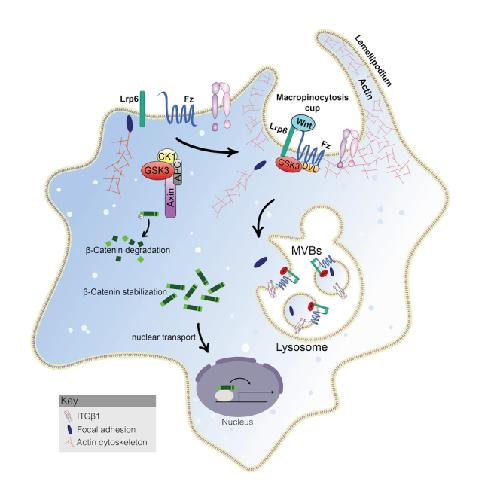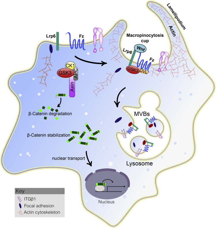 Figure 7. Model of the endocytosis of the focal adhesion and ITGβ1 by WntAfter Wnt treatment, Lrp6/Fz/Wnt/GSK3 signalosomes, the master regulator of cell adhesion ITGβ1, and other focal adhesion components are endocytosed by macropinocytic cups in an actin-driven process. Macropinocytosis is required for canonical Wnt signaling. Sequestration of GSK3 in MVBs is necessary for the stabilization of β-catenin that mediates the transcriptional activity of canonical Wnt.