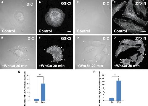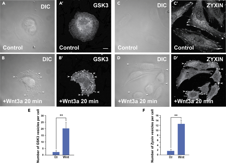 Figure 2. Wnt3a treatment caused the formation of vesicles that sequestered GSK3 and the focal adhesion protein zyxin; Immunostainings of endogenous GSK3 and zyxin(A–B′) Fluorescence microscopy images in HeLa cells showing that Wnt treatment (100 ng/mL, 20 min) caused the translocation of GSK3 from the cytosol into vesicles. Note that Wnt3a protein caused the formation of prominent vesicles visible by light microscopy (arrowheads).(C–D′) The focal adhesion protein zyxin is sequestered in vesicles, as GSK3 is, by 20 min Wnt stimulation. Images were generated using a Zeiss Imager Z.1 microscope with Apotome using high magnification.(E–F) Quantification of the immunofluorescence found in vesicles (see STAR Methods). Scale bars, 10 μm. Error bars denote SEM (n ≥ 3) (∗∗p < 0.01). See also Figure S2.