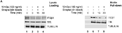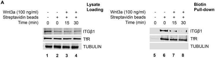 Figure 3. Integrin beta-1 is rapidly endocytosed by WntTime course (0–30 min) of Wnt3a treatment was performed in HeLa cells at a permissive temperature for endocytosis. After that, the plasma membrane was labeled with Sulfo-NHS-SS-Biotin on ice for 30 min. Pull-down assay with streptavidin-agarose beads showed that Wnt treatment induced the endocytosis of ITGβ1 after 15 min. Lanes 1–4 are HeLa Cell lysate loading controls. Lanes 5–8 show samples after pull-down with biotin agarose beads. Cell extracts were analyzed by western blot with ITGβ1 antibody. Note that cell surface ITGβ1 is endocytosed after 15 or 30 min of Wnt3a treatment. Transferrin Receptor (TfR) was used as a specificity control that is recycled independently of the Wnt pathway. Tubulin antibodies served as a control for cytoplasmic contamination. Similar results were obtained in three independent experiments. See also Figure S3.
