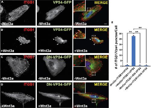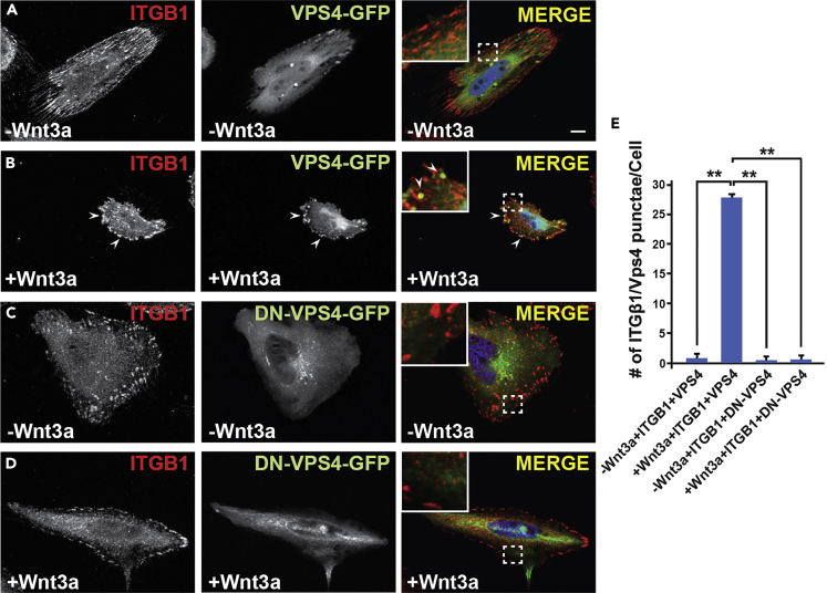 Figure 5. Integrin β-1 colocalizes together with the multivesicular endosome marker Vps4, but not with its dominant-negative point mutant Vps4-EQ(A and B) HeLa cells transiently transfected with Vps4-GFP were analyzed using fluorescence microscopy with anti- ITGβ1 antibody. Wnt3a treatment of 20 min caused the re-distribution of ITGβ1 into puncta, known to correspond to MVBs (Taelman et al., 2010), indicated by arrowheads.(C and D) Overexpression of the dominant-negative-Vps4-GFP construct containing a single mutation (EQ) in the ATP binding site blocked the induction of ITGβ1 vesicles by Wnt protein. All assays were performed in triplicate. Scale bars, 10 μm.(E) Quantification of ITGβ1 and Vps4 double-positive puncta in transfected HeLa cells. Error bars denote SEM (n ≥ 3) (∗∗p < 0.01).