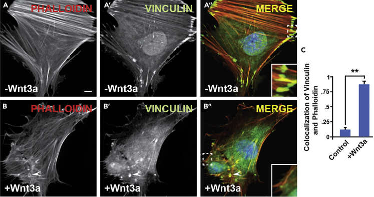 Figure 1. Wnt3a treatment for 20 min causes a major rearrangement of the actin cytoskeleton and focal adhesions in human corneal stromal (HCSF) fibroblasts(A-A″) Image of HCSF fibroblast showing that the cells attach well to fibronectin-coated plastic, have prominent F-actin cables stained by Phalloidin (in red), and abundant focal adhesion sites immunostained with vinculin (in green).(B-B″) Wnt3a treatment causes disorganization of the actin cytoskeleton, vinculin becomes associated with intracellular vesicles sometimes surrounded by F-actin (indicated by arrowheads), and few focal adhesions are visible. Similar results were obtained in three independent experiments. Insets show higher magnifications of actin and vinculin colocalization. Nuclei were stained with DAPI. Scale bars, 10 μm.(C) Quantification of the colocalization of vinculin and the F-actin marker phalloidin by Pearson’s correlation coefficient using ImageJ. Error bars denote SEM (n ≥ 3) (∗∗p < 0.01). See also Figure S1 and Video S1. Mutation in Axin1 causes extensive membrane ruffling and macropinocytosis in HCC cells, related to Figures 1 and S1, Video S2. Mimicking Wnt with the GSK3 inhibitor LiCl triggers macropinocytic cup formation in cultured Xenopus animal cap cells, related to Figures 1 and S1, Video S3. Activated Ras-GFP triggers macropinocytosis, related to Figures 1 and S1, Video S4. Increased cell motility triggered in Xenopus animal cap cells by the GSK3 inhibitor LiCl, which mimics Wnt signaling, related to Figures 1 and S1.