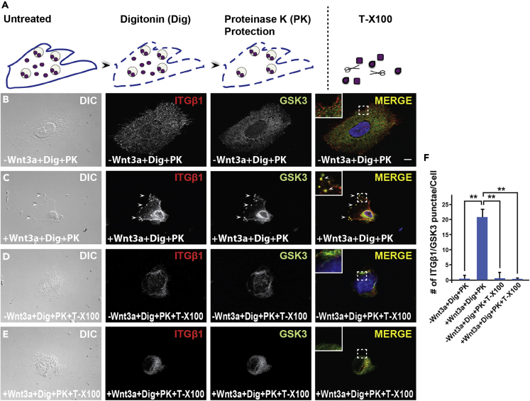 Figure 4. GSK3 and Integrin β-1 are protected from proteinase K digestion inside membrane-bounded organelles in digitonin-permeabilized cells, but not in the presence of Triton X-100 which solubilizes intracellular membranes(A) Diagram of steps involved in the in situ protease protection assay.(B and C) HeLa cells plated on glass coverslips were permeabilized with digitonin, treated with proteinase K to digest cytosolic proteins, stained with ITGβ1 and GSK3 antibodies, and analyzed by fluorescence microscopy. ITGβ1 and GSK3 were protease-protected within the same vesicles after treatment with Wnt3a protein for 20 min.(D and E) HeLa cells treated as described above, except for the addition of Triton X-100, used as control, which dissolves inner membranes and leads to the digestion by exogenous protease of ITGβ1 and GSK3; DAPI labels nuclei. All of the assays were performed in triplicate. Insets show higher magnification views. Scale bars, 10 μm.(F) Quantification of the number of puncta double-stained with ITGβ1 and GSK3 antibodies in protease protection assay using ImageJ. Error bars denote SEM (n ≥ 3) (∗∗p < 0.01). See also Figure S4.