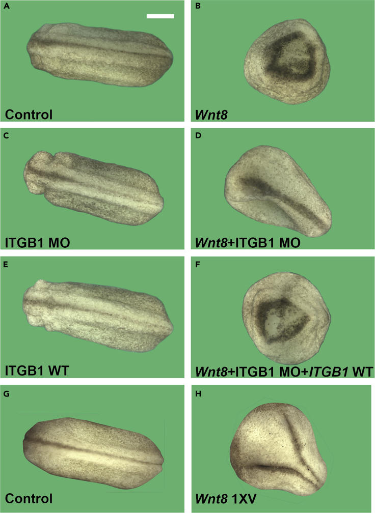 Figure 6. ITGβ1 MO inhibits Wnt signaling in a sensitized Xenopus embryo assay in which injection of xWnt8 four times into the animal pole induces a radial dorsalized phenotype(A) Control Xenopus embryos at early tail bud.(B) Embryos injected four times in the animal region at the 4-cell stage with 0.5 pg Wnt8myc mRNA consistently induced a radial head phenotype lacking any trunk development.(C) No phenotype was observed with ITGβ1 MO alone.(D) Co-injection of xITGβ1 antisense MO consistently inhibited the dorsalizing effects of xWnt8, allowing the formation of partial axial structures.(E) Microinjection of human ITGβ1 mRNA was without phenotypic effect.(F) The effect of ITGβ1 MO was specific because it was rescued by human ITGβ1 mRNA which is not targeted by the MO sequence.(G and H) Injecting the same dose (0.5 pg) of xWnt8myc mRNA into a single ventral marginal location in 4-cell embryos induces the familiar axis duplication phenotype; it is shown here to contrast with the radial dorsalized phenotype caused by four injections into the animal pole used in this sensitized assay system. Images were taken with an Axio Zoom V.16 Stereo Zoom Zeiss at low magnification. Similar results were obtained in five independent experiments. Numbers of embryos analyzed were as follows A = 140, 100%; B = 128, 97%; C = 132, 98%; D = 125, 92%; E = 129, 100%; F = 124, 85% (5 independent experiments); G = 48, 100%; H = 92, 91% complete axes (2 independent experiments). Scale bar, 500 μm. For β-catenin reporter assay in animal caps, see Figure S5.