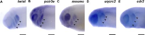 FIGURE 1. 16p12.1-affected genes are expressed in migrating neural crest cells during embryonic development. (A) Lateral view of whole-mount in situ hybridization at stage 25 for twist, a NCC-enriched transcription factor. Anterior of embryo is to left. Arrows indicate the pharyngeal arches (PAs). (BâE) In situ hybridization at stage 25â28 for polr3e, mosmo, uqcrc2, and cdr2 demonstrate expression in NCCs that occupy the PAs (n = 10 per probe). Scalebar = 300 μm.