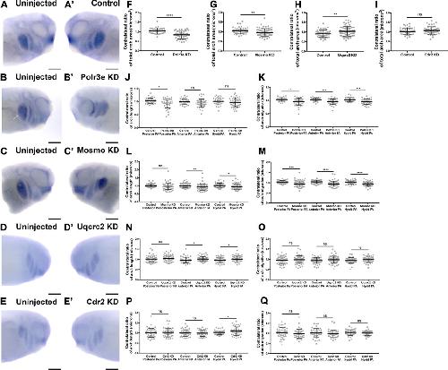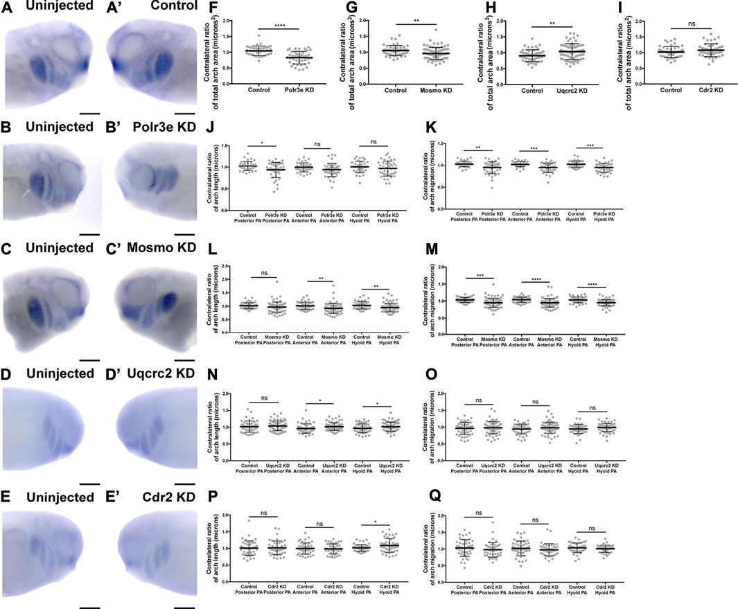 FIGURE 3. Knockdown of Polr3e and Mosmo affect CNC migration in vivo. (AâC, Aâ²âC) (AâE, Aâ²âEâ²) Lateral views of stage 25 embryos following whole-mount in situ hybridization against twist. Each column of panels are lateral views of two sides of the same embryo. Embryos were unilaterally injected to KD each individual 16p12.1-affected gene in half of the embryo and the other half was left uninjected. The left panels (AâE) represent the uninjected side and the right panels (Aâ²âEâ²) represent the injected side. (FâQ) Measurements were taken for the total area of the three PAs (posterior PA, anterior PA, and hyoid PA), the length of each individual arch, and the NCC migration distance, as measured from the dorsal-most tip of each arch to the neural tube, by taking ratios of the injected side versus the uninjected side. Significance was determined using an unpaired students t-test with these ratios. (FâH) Partial depletion of both Polr3e and Mosmo significantly reduced the total area of the three PAs, while partial depletion of Uqcrc2 slightly increased the total area of the three PAs. (JâK) Polr3e KD significantly reduced the length of the posterior PA but had no effect on the length of the anterior PA or hyoid PA. However, partial depletion of this gene significantly reduced the total NCC migration distances for all three PAs. (LâM) Mosmo KD significantly reduced the length of the anterior PA and hyoid PA but had no effect on the length of the posterior PA. Partial depletion of this gene also significantly reduced the total NCC migration distance for all three PAs. (NâO) Uqcrc2 KD slightly increased the length of the anterior and hyoid PA but had no effect on the length of the posterior PA, nor did it affect the total NCC migration distance. (I, PâQ) Cdr2 KD had no effect on the total area of the three PAs, nor did it affect the total NCC migration distance. However, partial depletion of this gene slightly increased the length of the hyoid PA but did not affect the posterior or anterior PAs. (Embryos quantified: Control for Polr3e = 35, Control for Mosmo = 48, Control for Uqcrc2 = 48, Control for Cdr2 = 45, Polr3e KD = 41, Mosmo KD = 75, Uqcrc2 KD = 68, Cdr2 KD = 45). ****p < 0.0001, ***p < 0.001, **p < 0.01, *p < 0.05, n.s., not significant. Scalebar = 300 μm.