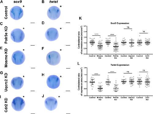 FIGURE 6. Manipulation of Polr3e and Mosmo affects NCC specification In situ hybridization utilized (A,C,E,G,I) antisense mRNA probe against sox9 and (B,D,F,H,J) antisense mRNA probe against twist. Each column of panels are dorsal views of two sides of the same embryo. Embryos were unilaterally injected to KD each individual 16p12.1-affected gene in half of the embryo and the other half was left uninjected. The left side represents the uninjected side and the right side, indicated with an asterisk (*), represents the injected side. Anterior of embryo is at the top. (KâL) Measurements were taken for the total area of the expression pattern for either sox9 (K) or twist (L) using the polygon tool in ImageJ by taking ratios of the injected side versus the uninjected side. Significance was determined using an unpaired students t-test with these ratios. Partial depletion of either Mosmo or Polr3e significantly reduced the total area of expression for both sox9 and twist, while partial depletion of either Uqcrc2 or Cdr2 did not significantly affect the total area of expression for either NCC specification marker. (Embryos quantified with sox9 probe: Control for Polr3e = 60, Control for Mosmo = 66, Control for Uqcrc2 = 25, Control for Cdr2 = 36, Polr3e KD = 55, Mosmo KD = 69, Uqcrc2 KD = 27, Cdr2 KD = 59. Embryos quantified with twist probe: Control for Polr3e = 20, Control for Mosmo = 33, Control for Uqcrc2 = 23, Control for Cdr2 = 46, Polr3e KD = 25, Mosmo KD = 41, Uqcrc2 KD = 44, Cdr2 KD = 50). ****p < 0.0001, ***p < 0.001, **p < 0.01, *p < 0.05, n.s., not significant. Scalebar = 300 μm.