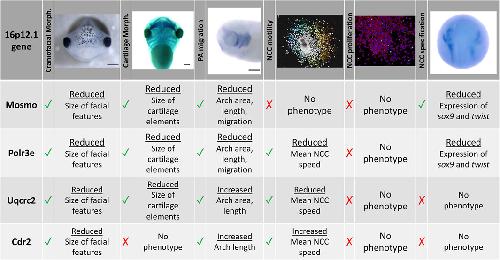 FIGURE 7. Summary table of 16p12.1-affected gene craniofacial, cartilage, and NCC phenotypes. Partial depletion of 16p12.1-affected genes demonstrates numerous impacts on craniofacial, cartilage, and CNC development. Tissues are denoted as affected (checked box) if phenotypes were significantly different from control (p < 0.05); see individual figures for data distribution and statistics.