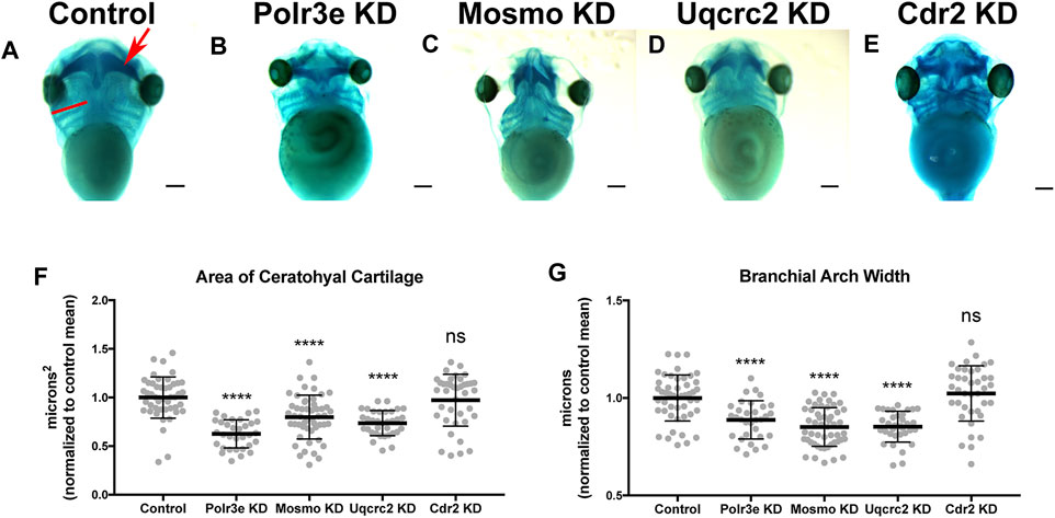 FIGURE 2. Knockdown of Polr3e, Mosmo, and Uqcrc2 impact cartilage morphology. (AâE) Ventral view of stage 42 embryos following single 16p12.1-associated gene KD, stained with Alcian blue to label cartilage elements. Anterior of embryo is at the top. In the control, the red arrow points to ceratohyal cartilage, while the red bar spans the first branchial arch. (FâG) Measurements of the average ceratohyal area and width of the first branchial arch. The data was normalized to the control MO condition. Partial depletion of Polr3e, Mosmo, and Uqcrc2 significantly reduced the size of both of these cartilage elements compared to controls, while depletion of Cdr2 had no effect on cartilage size. Significance determined using a studentâs unpaired t-test. (Embryos quantified: Control = 48, Polr3e KD = 32, Mosmo KD = 51, Uqcrc2 KD = 34, Cdr2 KD = 39). ****p < 0.0001, ***p < 0.001, **p < 0.01, *p < 0.05, n.s., not significant. Scalebar = 300 μm.