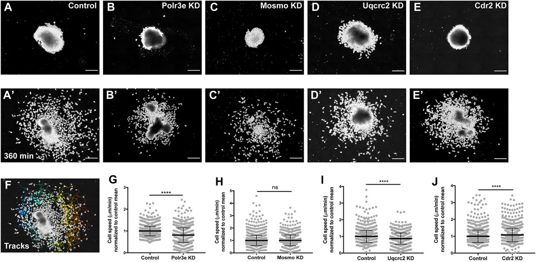 FIGURE 4. Manipulation of Polr3e, Uqcrc2, and Cdr2 impacts NCC migration speeds in vitro. Dissected NCC explants from control, Polr3e KD, Mosmo KD, Uqcrc2 KD, or Cdr2 KD embryos were plated on fibronectin-coated coverslips, allowed to adhere and begin migration, and imaged for 6 h using 20x phase microscopy. (AâE) Representative images of explants at initial timepoint (0 min). (Aâ²âEâ²) Representative images of explants after 6 h migration (360 min). (F) Representative tracks generated by FiJi Trackmate plug-in overlaid on panel Aâ. (GâJ) Mean track speeds of Polr3e KD, Mosmo KD, Uqcrc2 KD, and Cdr2 KD explants compared to their controls. Partial depletion of Polr3e and Uqcrc2 significantly reduced mean NCC speed, while depletion of Cdr2 increased mean NCC speed. Partial depletion of Mosmo had no effect on mean NCC speed. (Explants quantified: 6-7 explants from control and KD embryos were plated for each experiment. Three separate experiments were performed for each depletion.) ****p < 0.0001, ***p < 0.001, **p < 0.01, *p < 0.05, n.s., not significant. Scalebar = 200 μm.