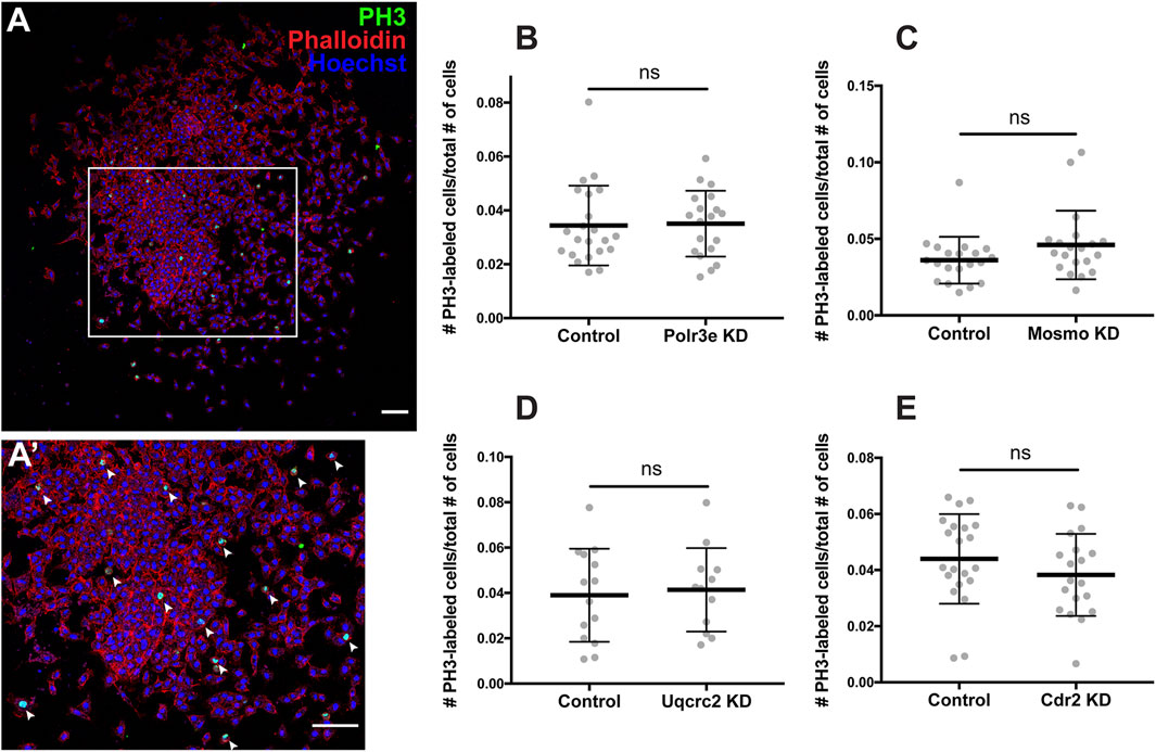 FIGURE 5. Manipulation of 16p12.1-affected genes does not impact NCC proliferation in vitro. Dissected NCC explants from control, Polr3e KD, Mosmo KD, Uqcrc2 KD, and Cdr2 KD embryos were plated on fibronectin-coated coverslips, allowed to adhere and begin migration for 4 h before being fixed in 4% PFA and immunostained with PH3 antibody as a marker for NCC proliferation, phalloidin to label the actin cytoskeleton, and Hoechst to label nuclei. (A,Aâ²) Representative image of control NCC explant immunostained with PH3, phalloidin, and Hoechst. White arrows denote cells positively labeled for PH3. (BâE) Quantification of the number of positively PH3-labeled cells versus the total number of cells per NCC explant for Polr3e KD, Mosmo KD, Uqcrc2 KD, and Cdr2 KD compared to controls. Partial depletion of each individual 16p12.1-affected did not have a significant impact on NCC proliferation in vitro. (Explants quantified: 6-7 explants from control and KD embryos were plated for each experiment. Three separate experiments were performed for each depletion). ****p < 0.0001, ***p < 0.001, **p < 0.01, *p < 0.05, n.s., not significant. Scalebar = 300 μm.