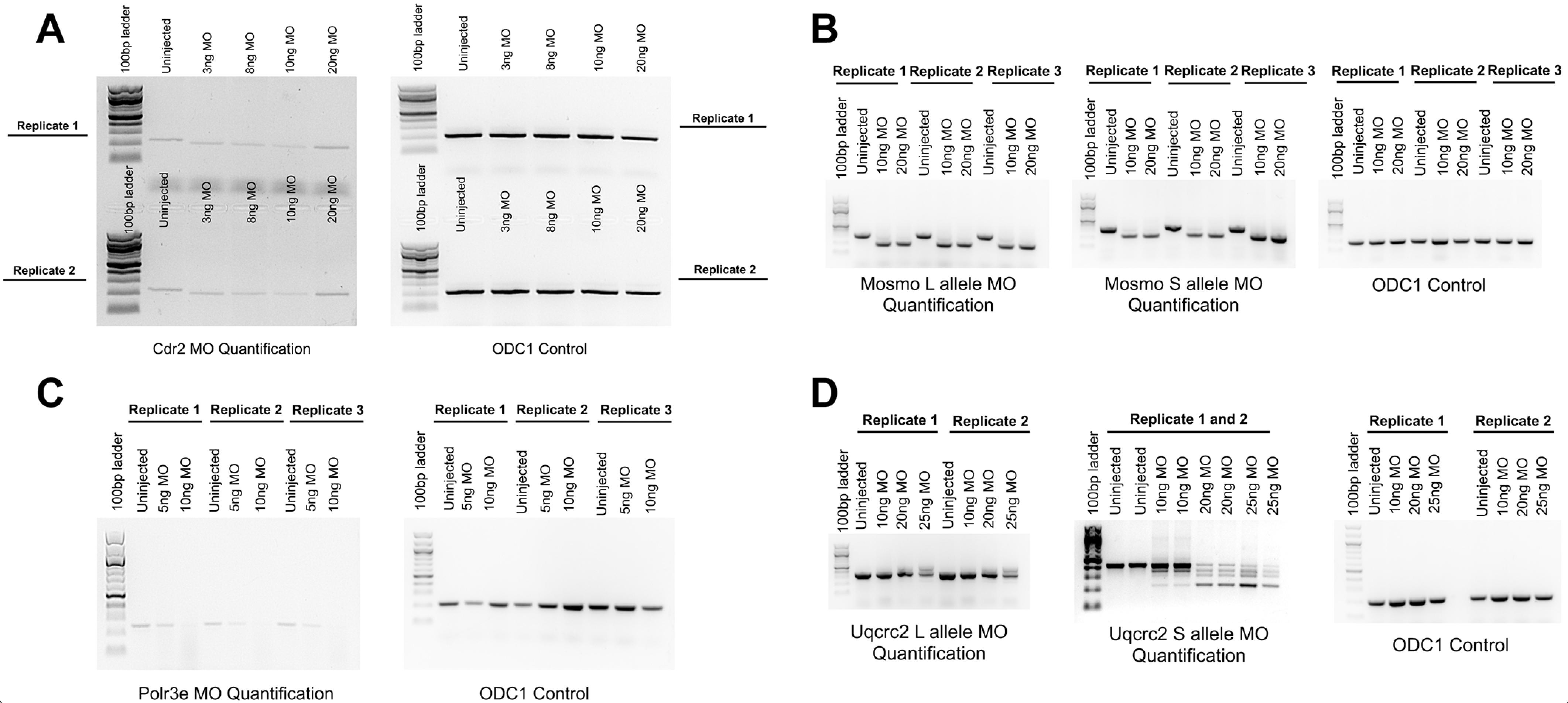 Figure S1. Validation of 16p12.1 morpholinos in X. laevis. (A-D) Electrophoretic gels show altered RNA expression of 16p12.1 gene homologs due to splice-site morpholino (MO) knockdown with increasing concentrations in X. laevis embryos. RNA was extracted from 10 two-day old whole embryos for each RT-PCR reaction. At least two replicates (uninjected and multiple MO concentrations) were performed for each MO, and band intensities were compared with expression of ODC1 controls taken from the same cDNA samples and run on gels processed in parallel. Splice site MOs were validated and densitometry was performed to quantify the effectiveness of alternative splicing in our previous manuscript, Pizzo et al., 2021.